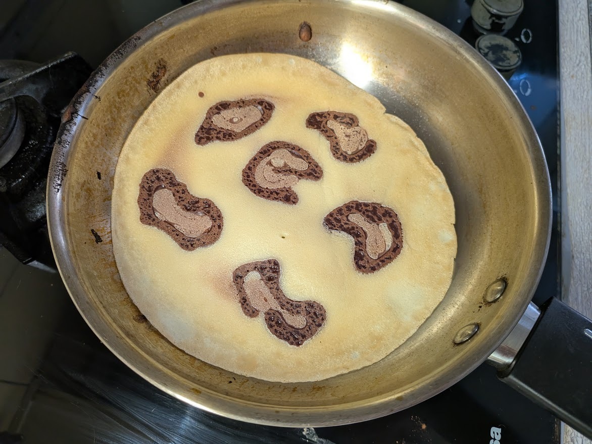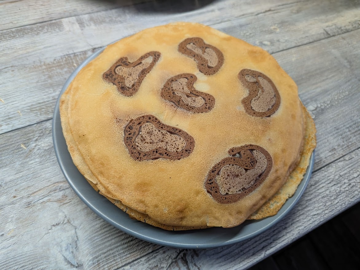 Нагрейте сковороду, можно стальную с толстым дном или антипригарным покрытием. Тонкой струйкой тёмного теста нарисуйте на ней пятнышки, добавьте для выразительности более светлого. Через секунду, как схватятся, распределите по сковороде 1/2 половника неподкрашенного теста. Дальше пеките блин как обычно, на среднем огне, не давайте им слишком подрумяниваться.