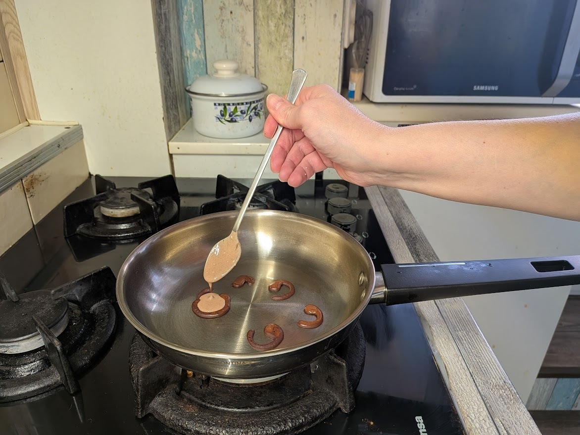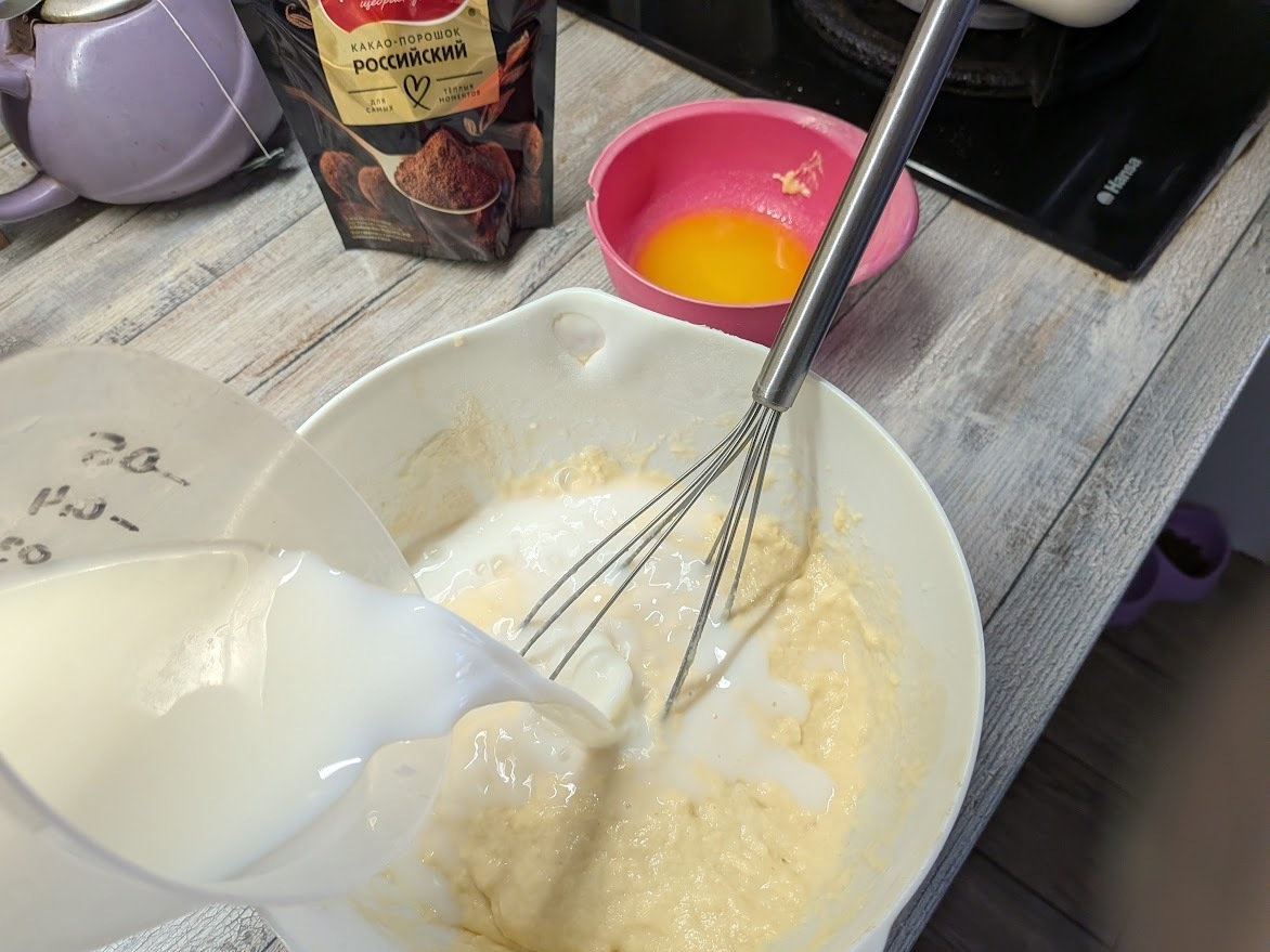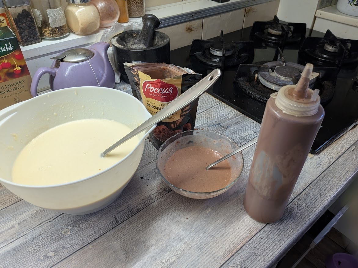 Отлейте в два соусника или небольшие пиалы по половнику теста — примерно столько, сколько нужно на 2-3 блина. Всыпьте туда какао: в одну порцию однй чайную ложку, во вторую — две, хорошо размешайте.
