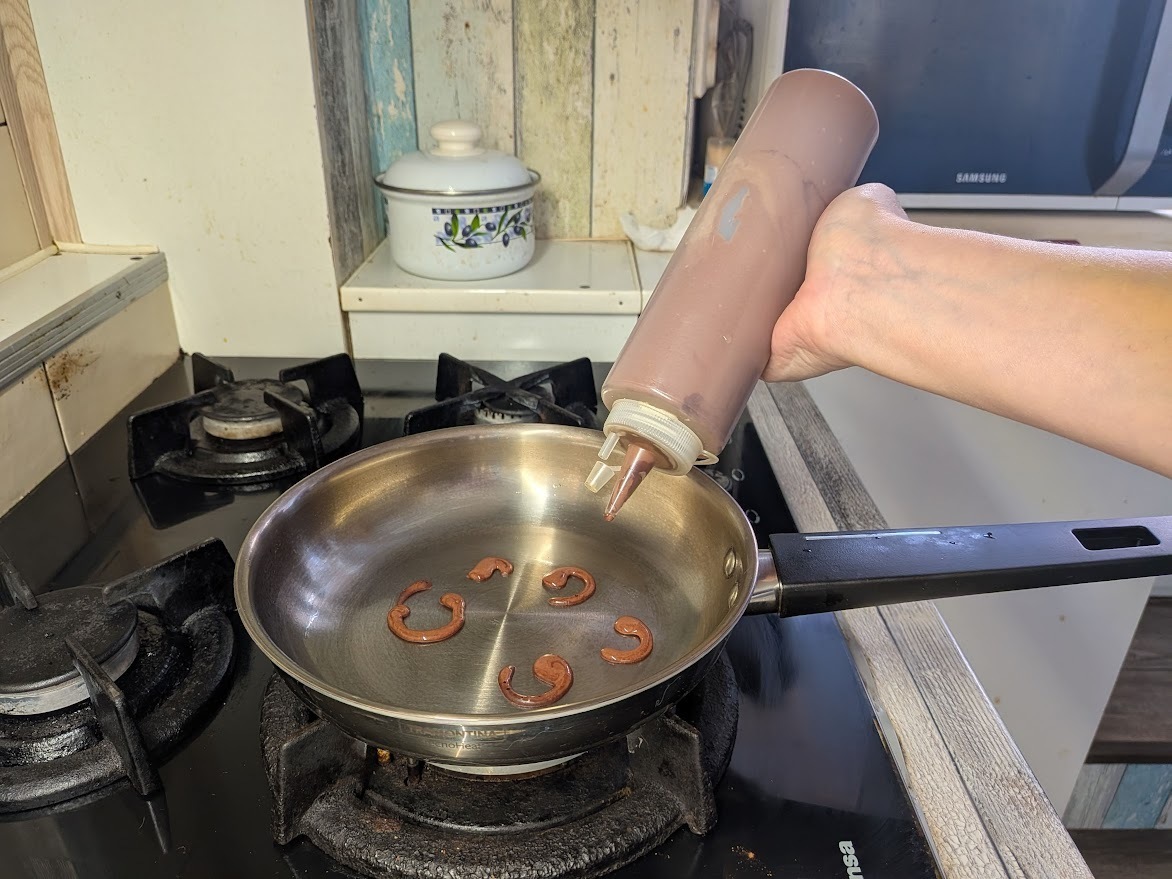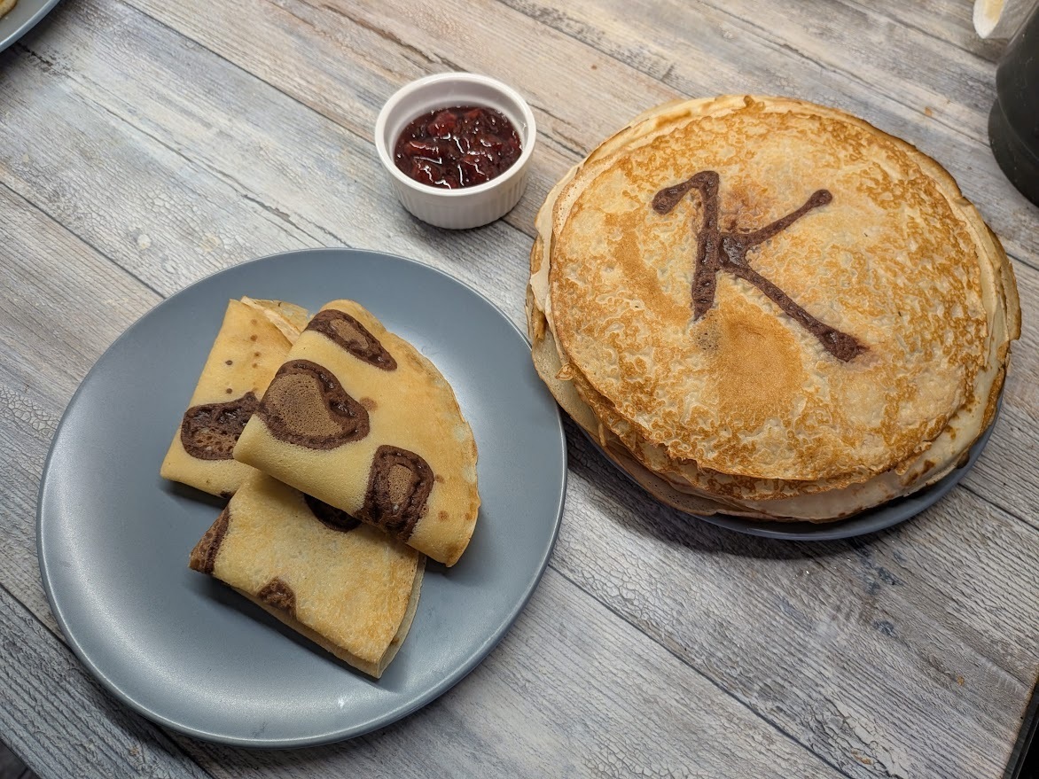 Сделать пятна, как у красивого хищника, можно на блинах с любым составом, но вкуснее всего получается из сладкого сдобного теста. Кроме обычной посуды для жарки блинов приготовьте один или два соусника с маленьким отверстием в колпачке.