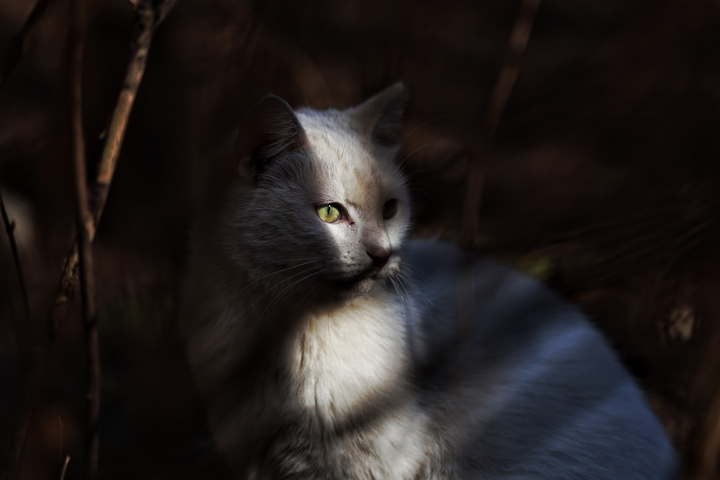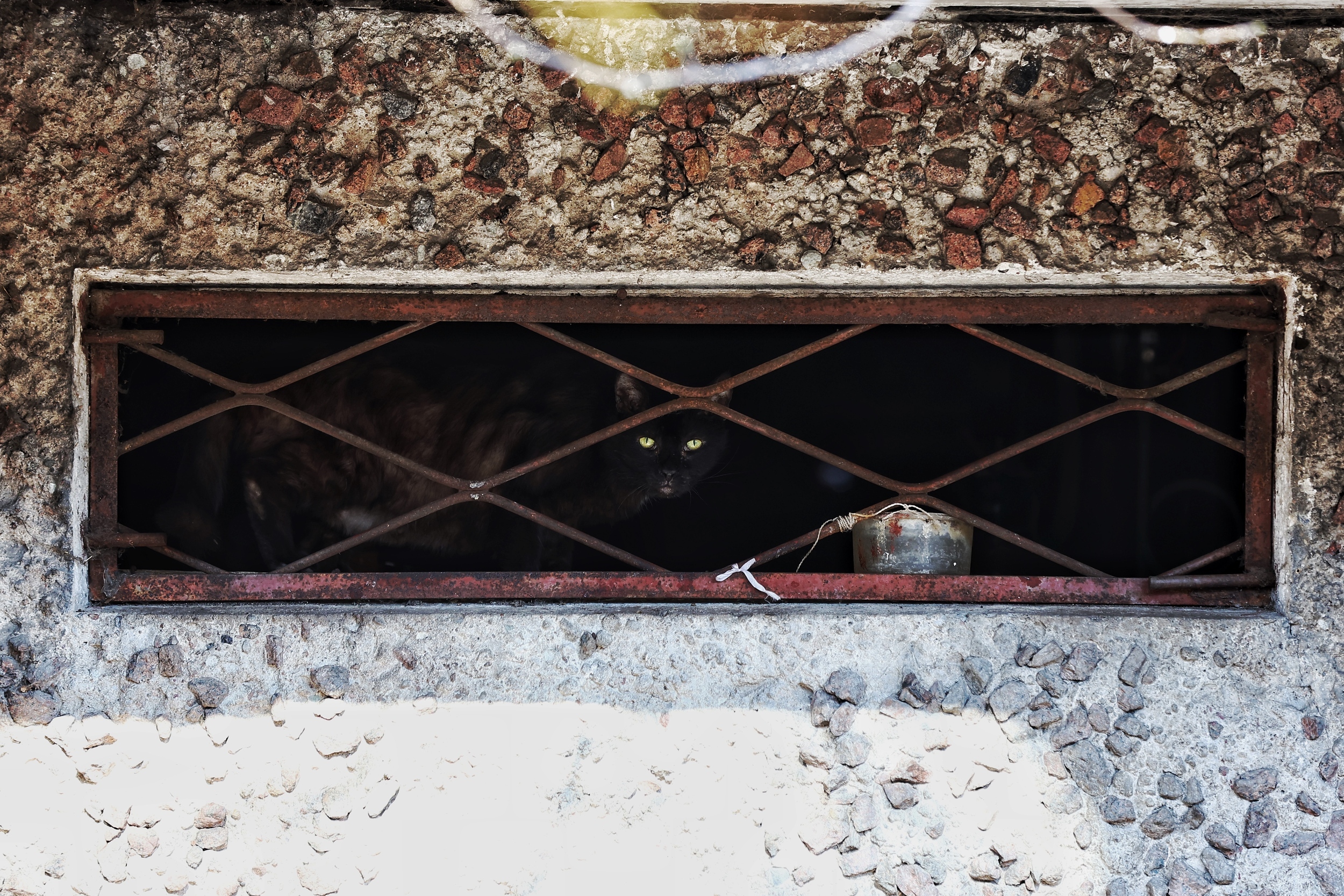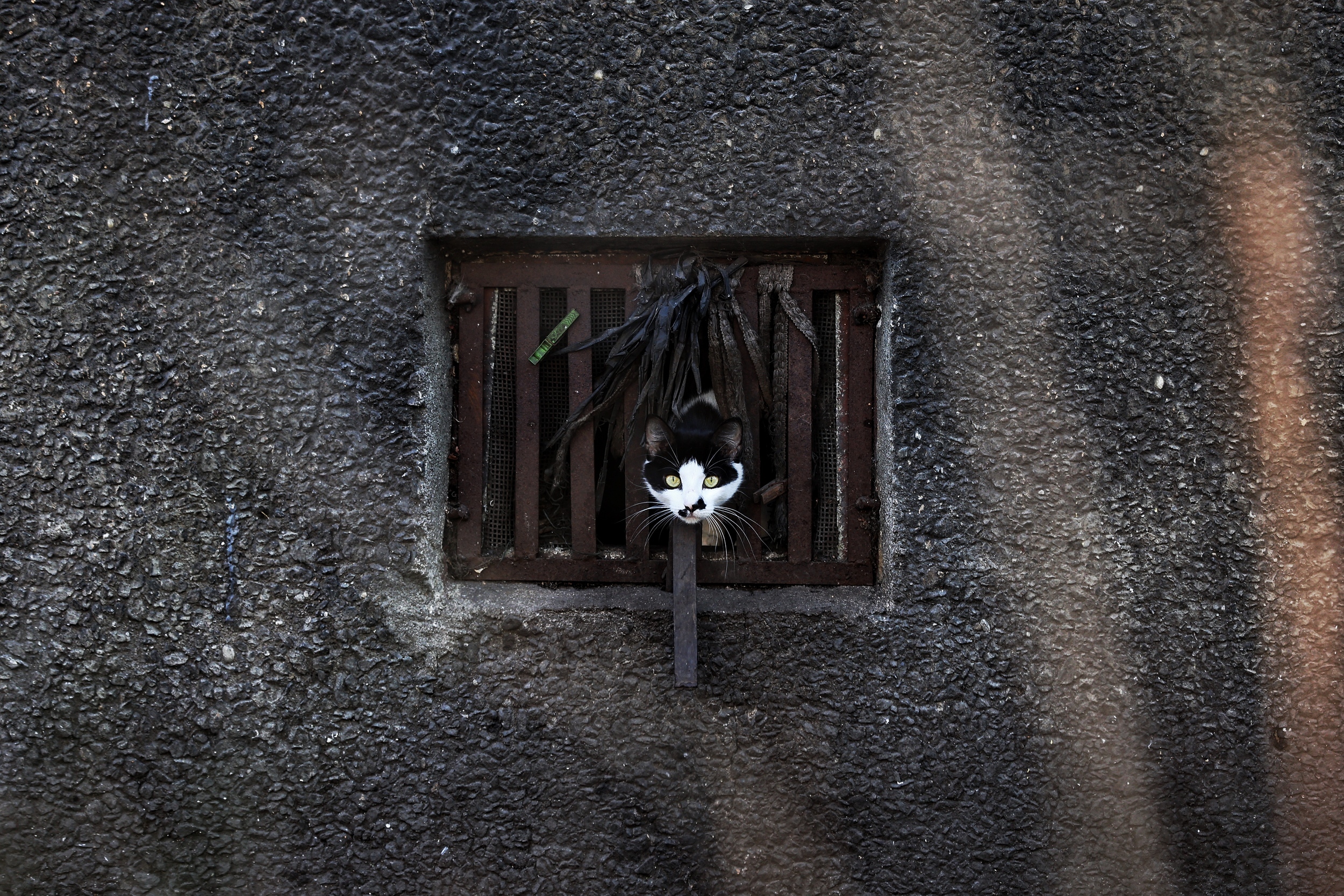 От объектива не укрылись и мурлыки, предпочитающие полумрак подвалов. Котиков выдали огромные жёлтые глаза и природное любопытство.