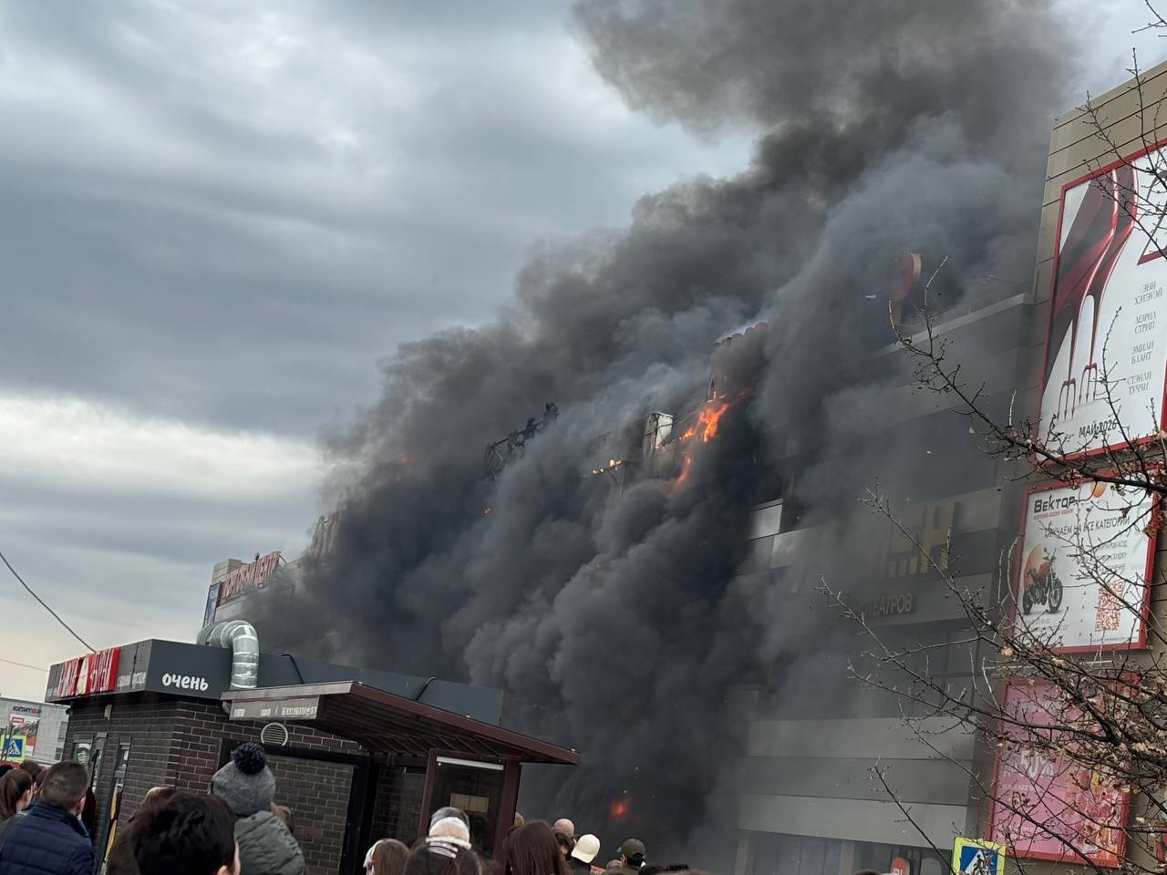 На кадрах видно, что в некоторых частях фасад почти полностью уничтожен огнём — в пламени даже оконные рамы. По данным источника в экстренных службах региона, к месту ЧП стянули почти все городские расчёты. Возле полыхающего торгового центра стоят как минимум четыре машины скорой помощи. Снаружи собралась толпа зевак, здание оцепили лентой.