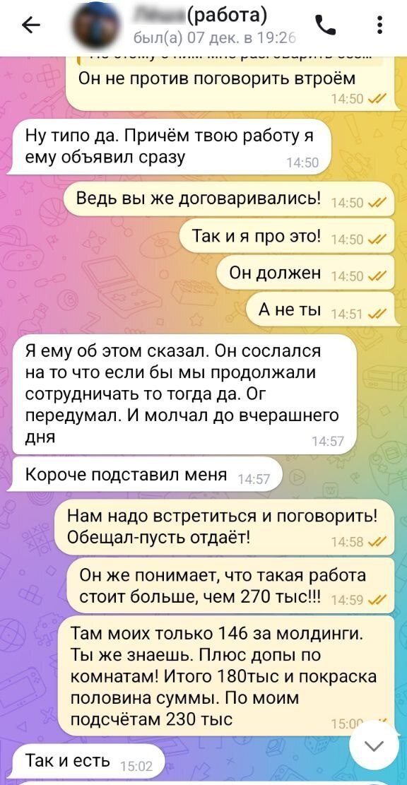 Но через несколько месяцев Карине позвонил знакомый, который раньше тоже нанимал Александра. Он рассказал, что её семья — не единственная, кто по его вине остался без денег. И это не только заказчики: коллеги добавляют его в чёрные списки, потому что он «забывает» рассчитаться с ними за работу.