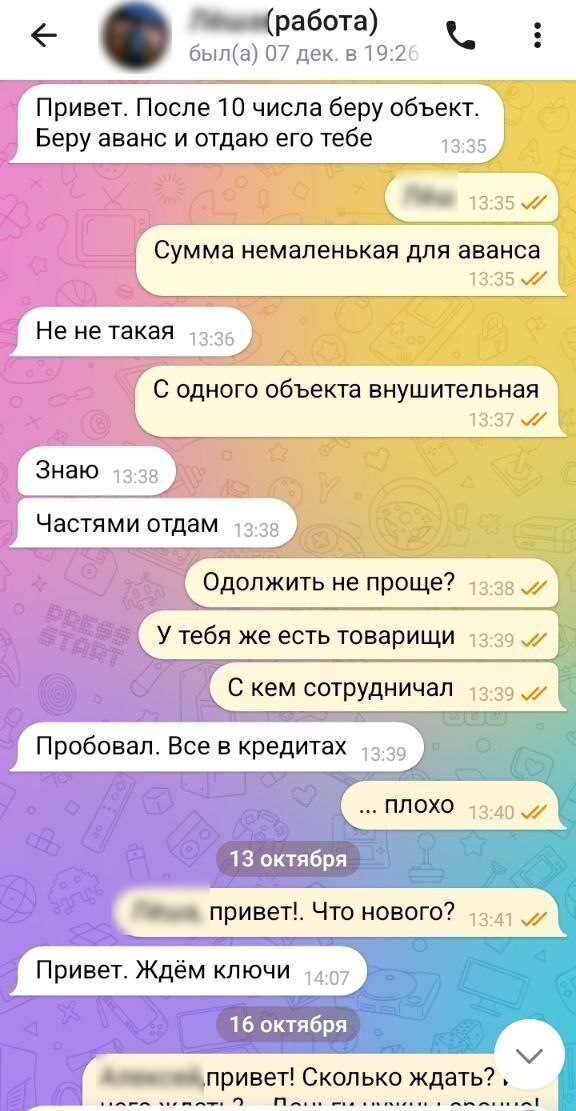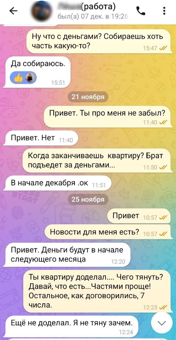 Женщина показала редакции скрины своей переписки с напарником. Александр убеждает Татьяну, что это заказчик его «подставил», жалуется на полную невозможность перезанять деньги и обещает всё отдать с ближайшего аванса, не раньше «начала следующего месяца». Вот только месяцы при этом постепенно меняются, а ситуация — остаётся прежней.
