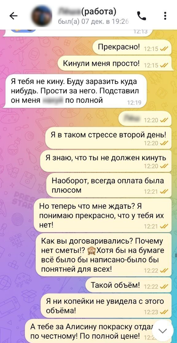 «Мы много лет работали вместе, — говорит она. — У него была договорённость с заказчиком, что тот рассчитывается с ним, а Александр уже со мной, когда всё закончим. Я спокойно работала, не брала аванс, думаю, сделаю работу и получу общую сумму. Там выходило около 240 тысяч.