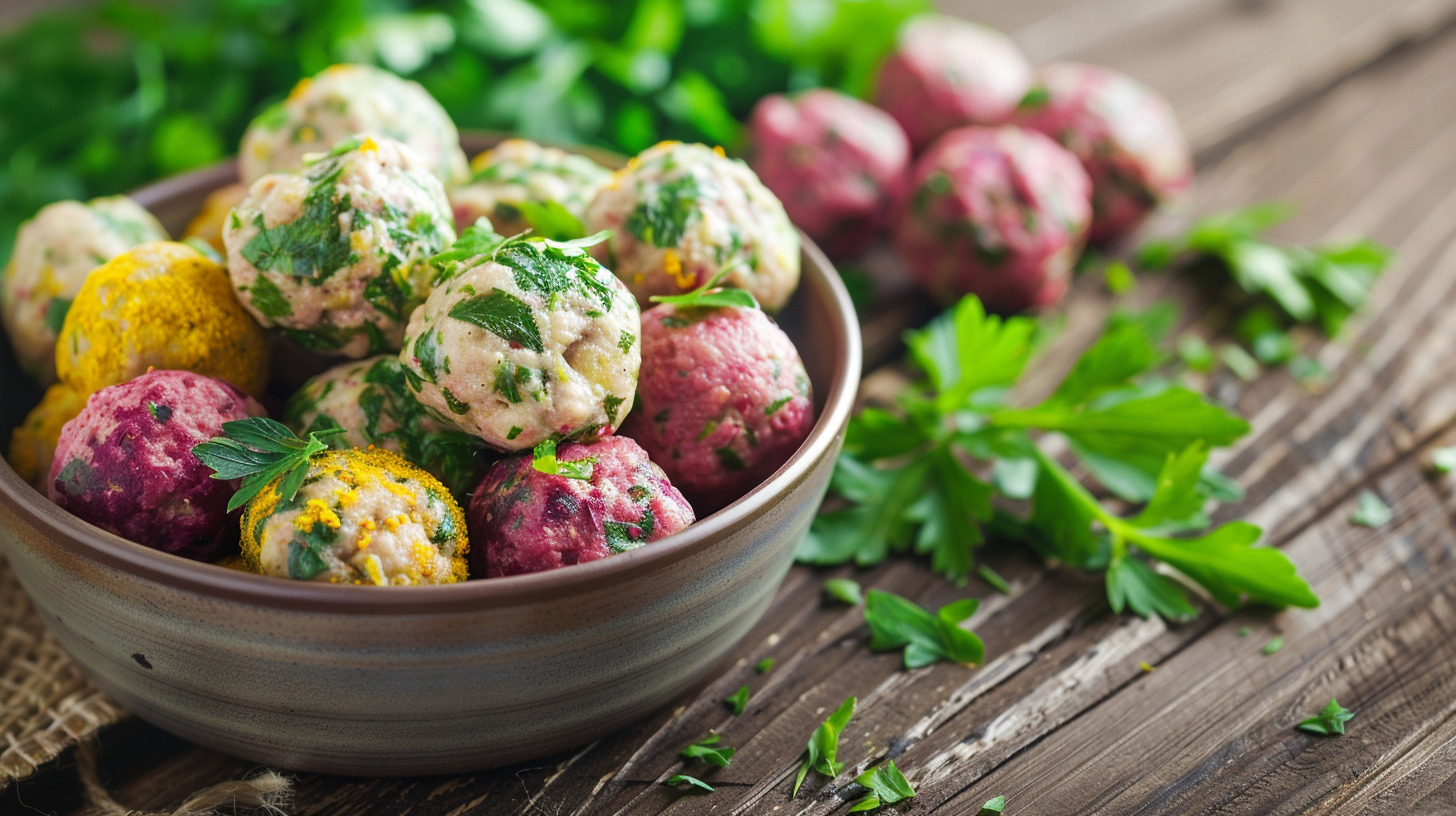Сформировать маленькие тефтельки и отварить их в кипящей воде. Каждый вид лучше готовить в разных кастрюлях или по очереди, иначе цвета смешаются. После всплывания варить ещё пару минут и подавать к столу.