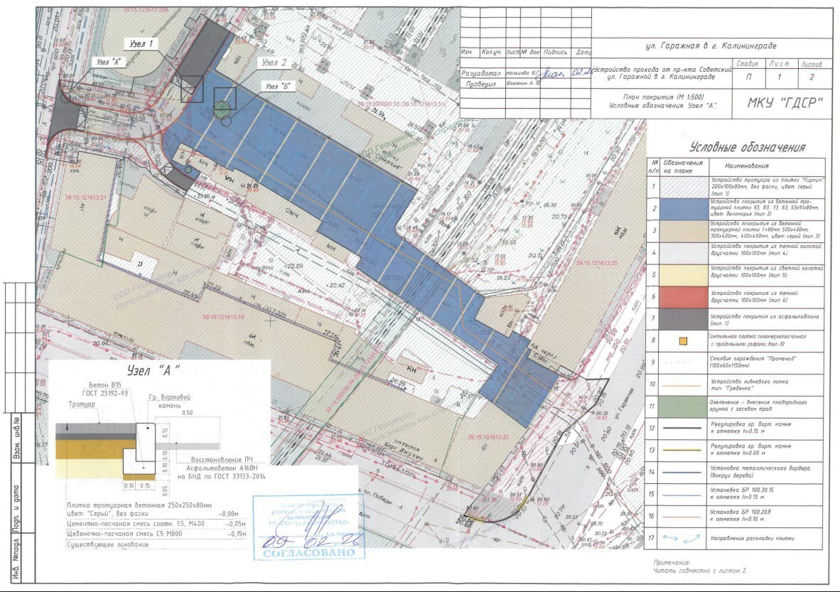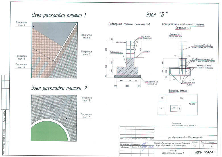 Согласно техзаданию, планируется замостить проход новой тротуарной плиткой, обновить бордюры и привести в порядок примыкания к проезжей части. В проекте также предусмотрены дополнительные работы, связанные с укреплением участка.