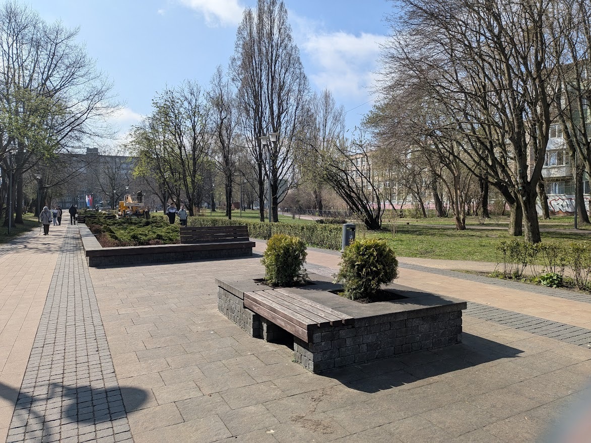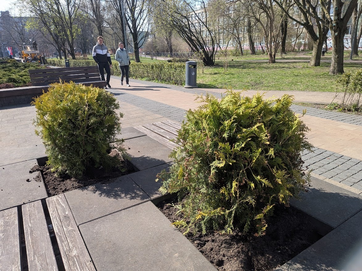 Первые новые растения появились в вазонах рядом с перекрёстком с улицей Соммера, в среду, 15 апреля, а к утру четверга они уже красовались во всех оставшихся. В общей сложности высажено 18 шаровидных кустарников породы туя западная.