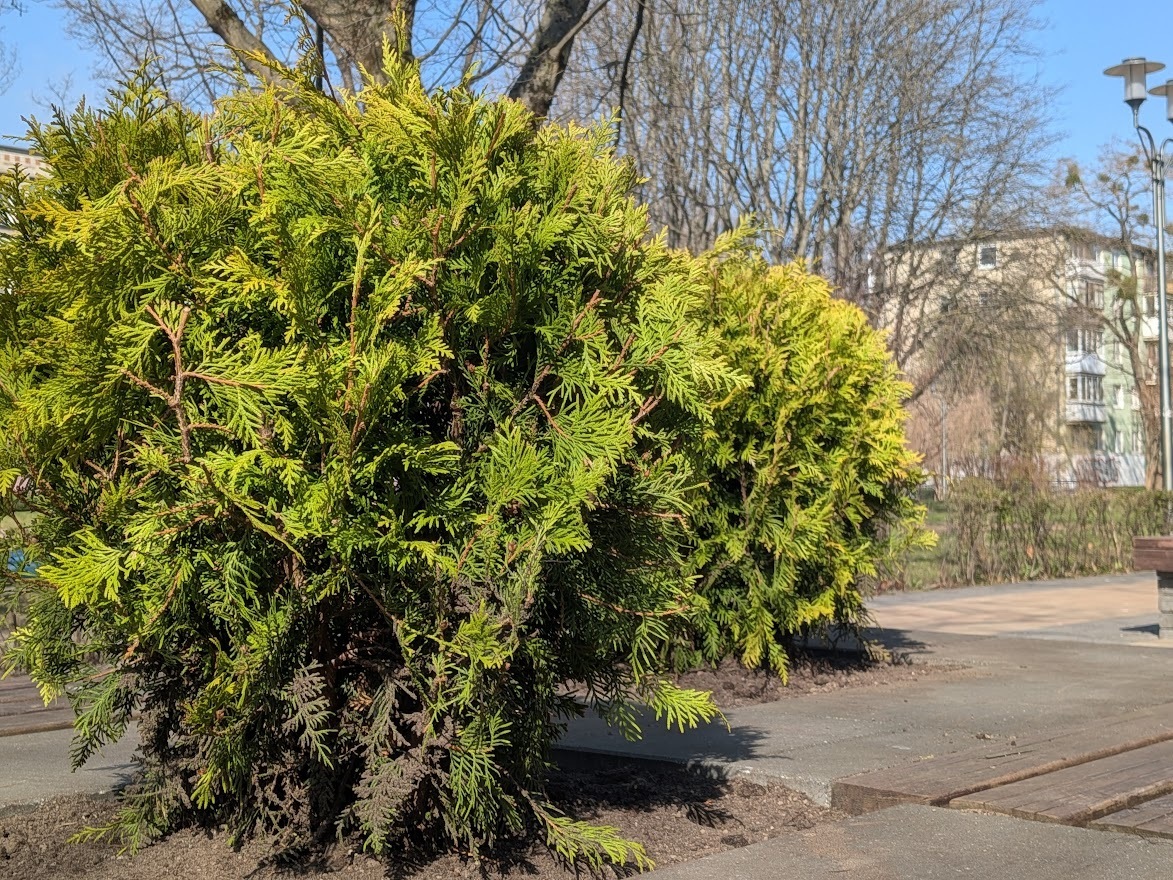 Если причиной гибели лавровишен стали аномальные холода (в вазонах корневая система промерзает мгновенно), то у туи перспективы лучше: она считается одним из самых морозостойких видов среди тех, что используются в России для озеленения. Пример хвойников, которые соседствовали с лавровишнями на Рокоссовского, это подтверждает — к весне у них разве что подсохли отдельные ветки.