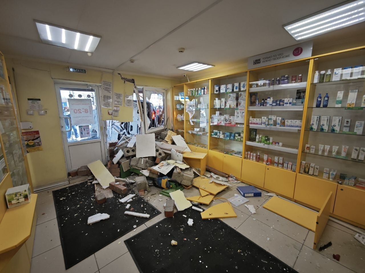 Как рассказали «Клопс» очевидцы, после удара на остановке «остался полный погром». Машины протаранили часть стены аптеки по соседству, в здании выбито окно, а на полу валяются осколки и куски кирпича. Снаружи одна из легковушек лежит на боку.