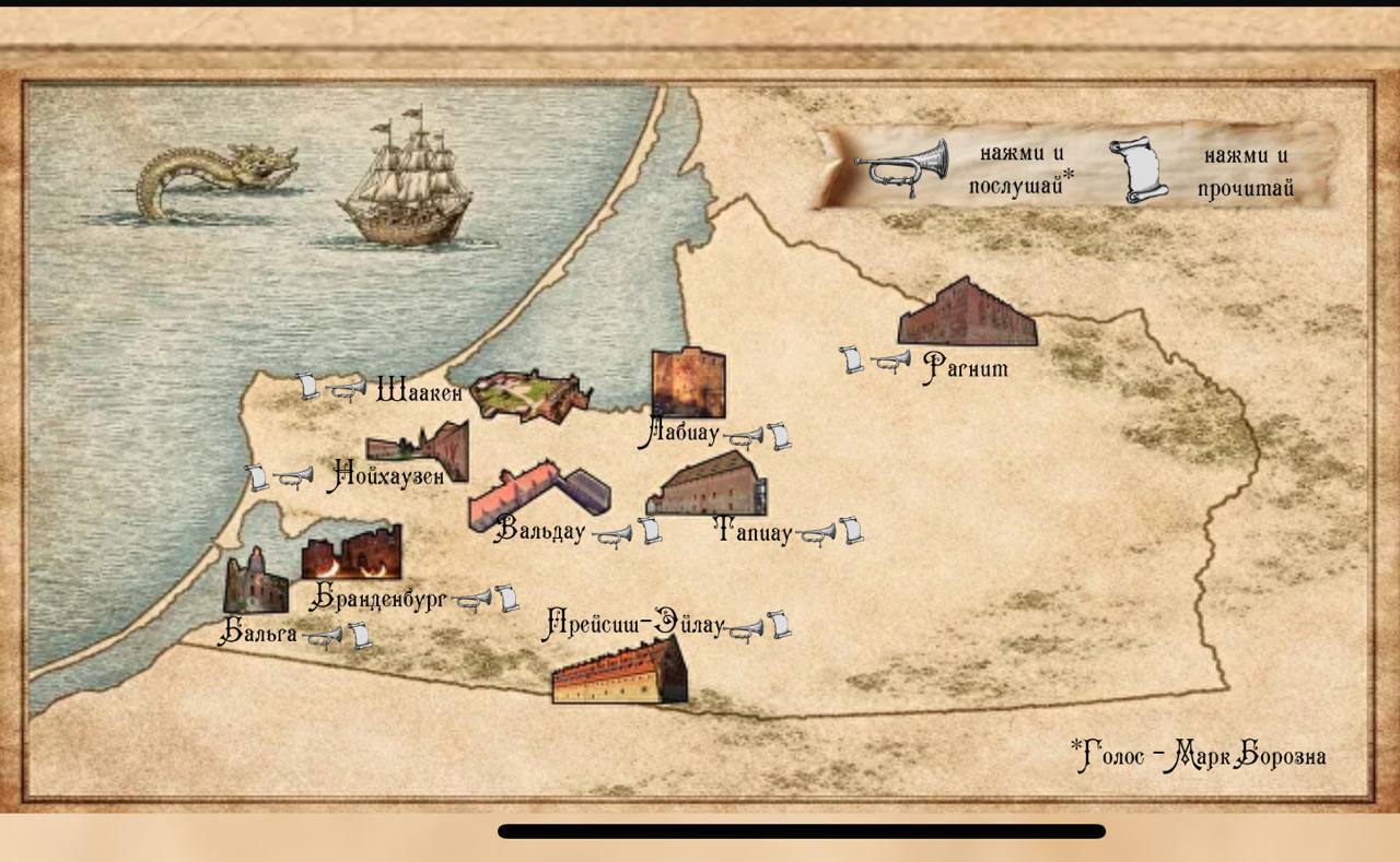 Есть у карты и звуковое сопровождение: краткое описание каждого замка в особой ироничной манере записал историк и тележурналист Марк Борозна. «Мы пытались озвучить её не классическим дикторским голосом в духе «Добрый вечер, товарищи!», а привнести долю, я бы сказал, художественного хулиганства»,— объяснил он.
