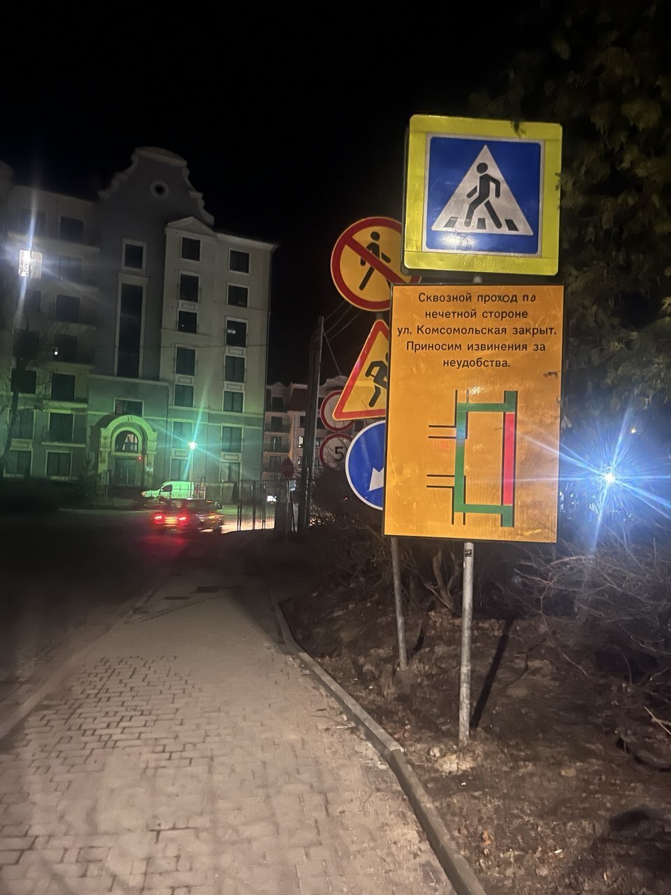 В Пионерском есть проблема с освещением и на улицах ближе к центру. Например, у перекрёстка Портовой и Комсомольской темно в районе велопешеходного перехода.