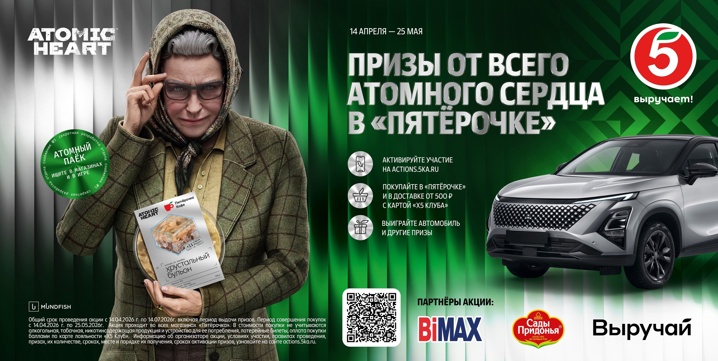 Торговая сеть «Пятёрочка» объявила о запуске федеральной акции «Призы от всего Атомного сердца в “Пятёрочке”». Коллаборация с популярной видеоигрой Atomic Heart (18+) приурочена к выходу нового дополнения (DLC 4).