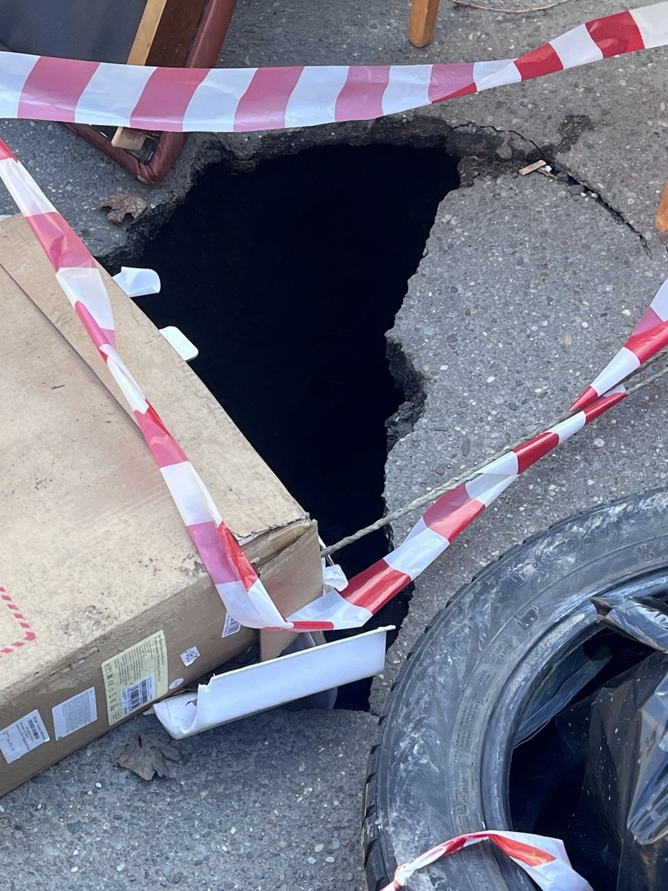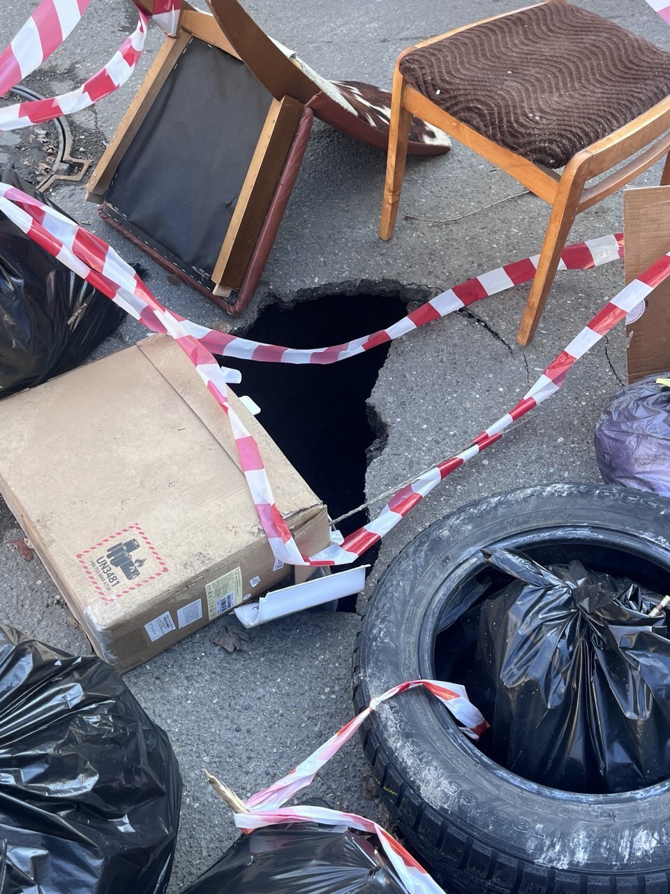 Ещё один опасный участок находится на улице Галковского. Провал в дорожном покрытии местные жители огородили подручными средствами: вокруг ямы поставили стулья, коробки, покрышки и даже пакеты с мусором, чтобы водители заметили яму.