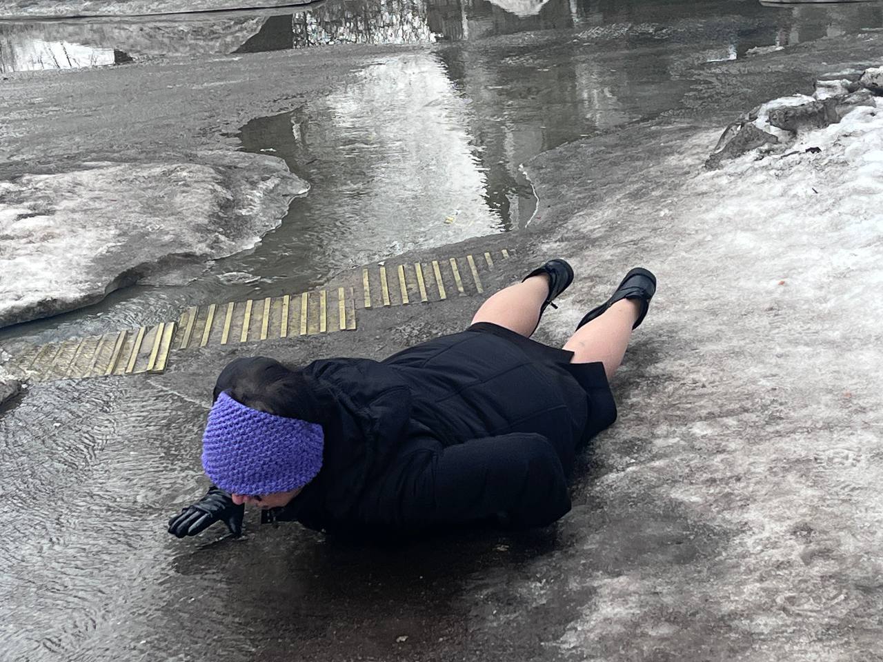 Люди пытаются обойти опасный участок, однако сделать это сложно: часть дорожки всё ещё покрыта ледяной коркой. Пешеходы поскальзываются и падают. Одна из женщин разбила лицо.