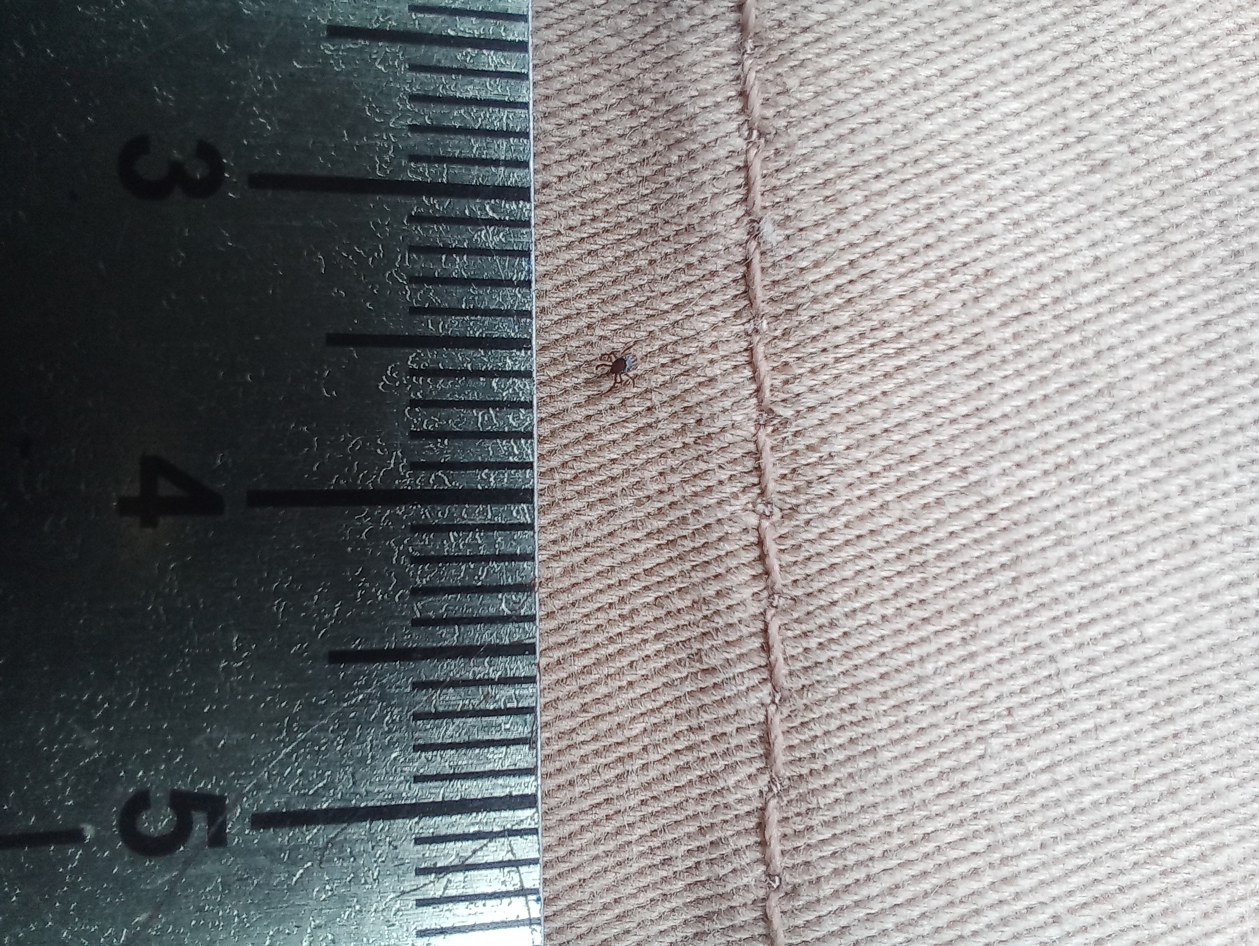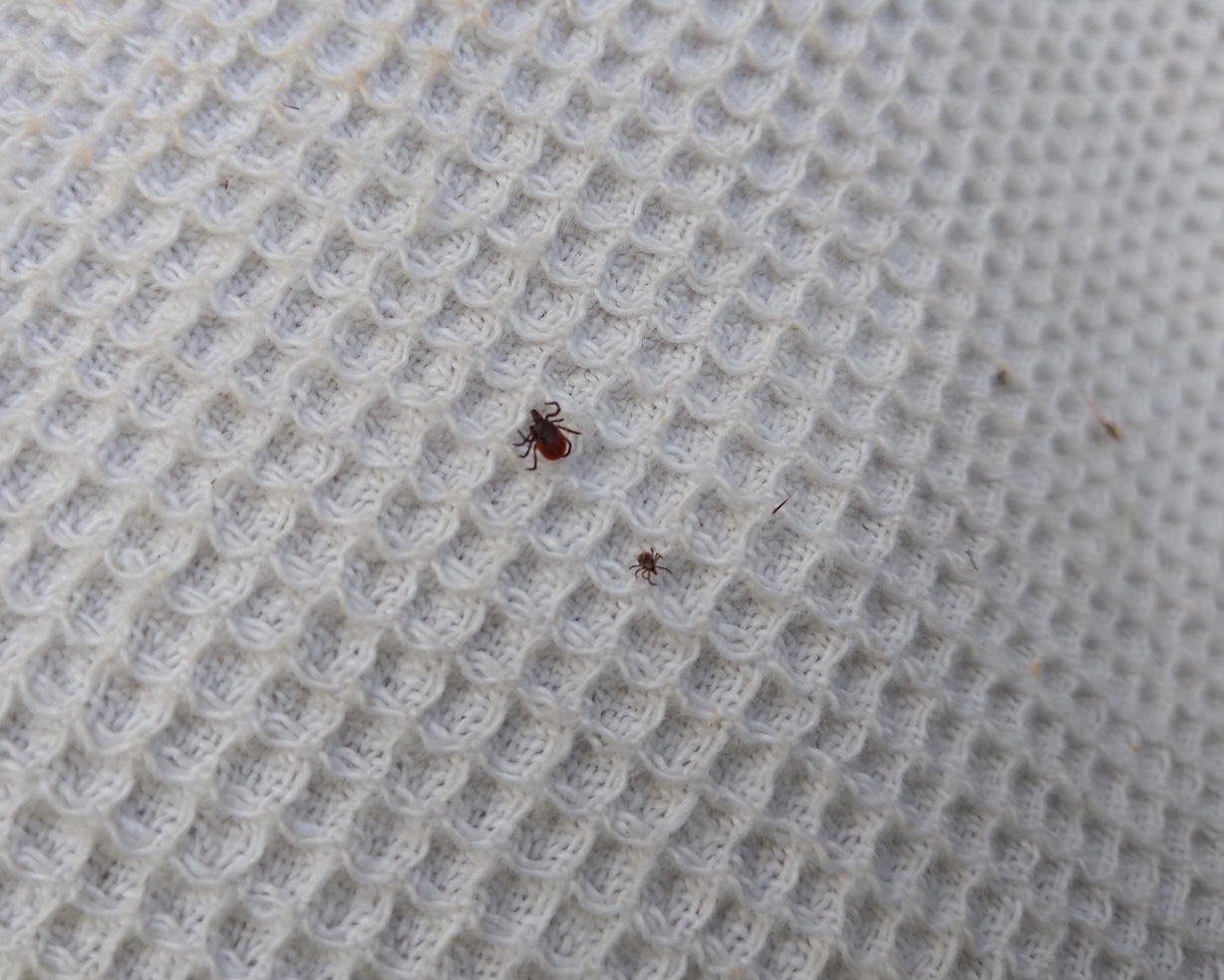 Взрослая женская особь (крупнее) и нимфа европейского лесного клеща (окрестности г. Светлый, лесная зона)