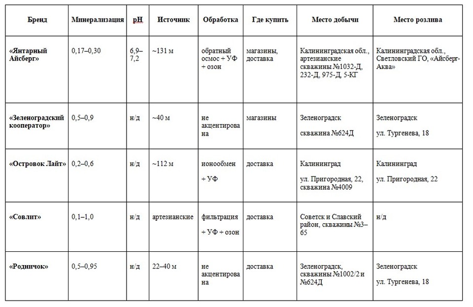 Место добычи: Калининградская область — артезианские скважины №1032-Д, 232-Д, 975-Д, 5-КГ (глубина 131 м)