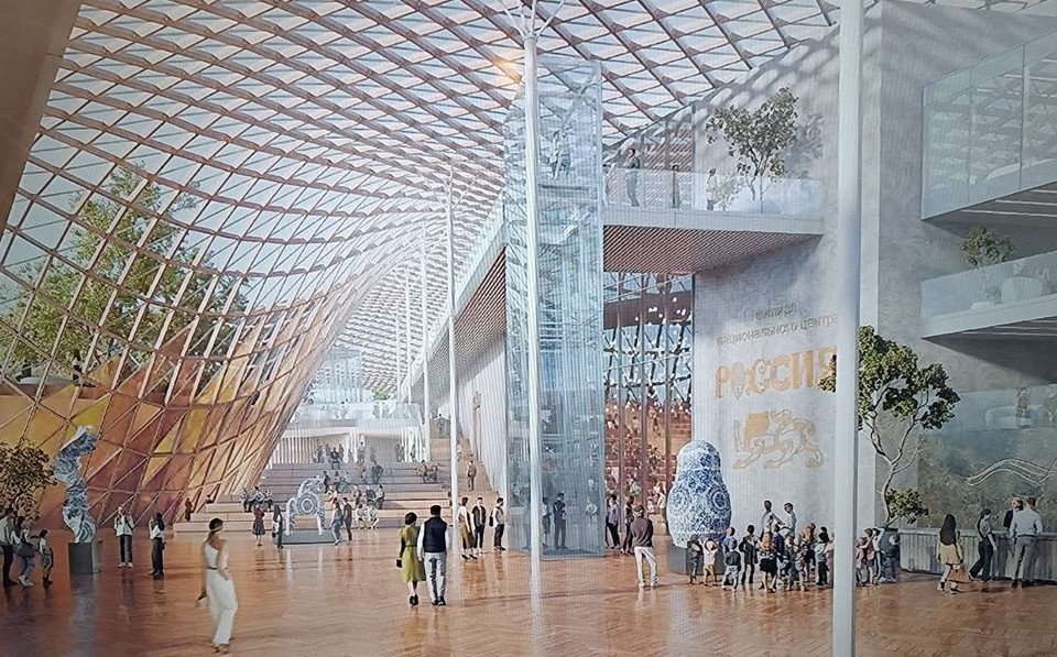 Сам центр «Россия» предполагают построить в современном стиле. Вместо крыши – огромная стилизованная волна. Внутри – просторные залы и общественные пространства. Рядом появится открытый амфитеатр под навесом.
