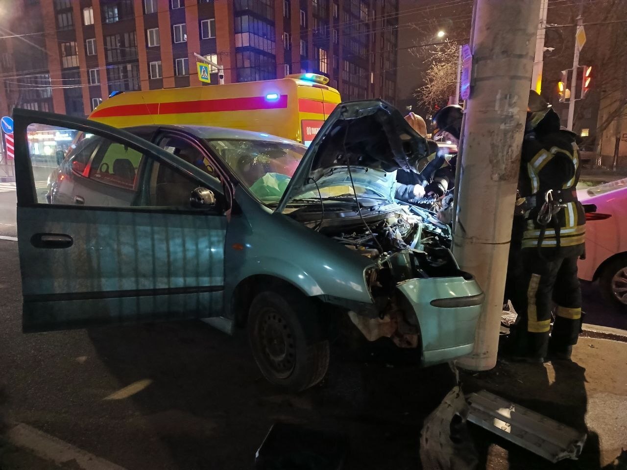 Капот всмятку, водитель и пассажир в скорой: в Калининграде у стадиона «Трудовые резервы» Nissan въехал в столб