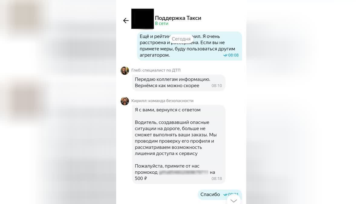 Однако утром женщина обнаружила, что её рейтинг в сервисе такси понижен до 4,61 балла! Тогда она написала в поддержку агрегатора и получила в ответ извинения, промокод на следующую поездку и обещание провести проверку инцидента.