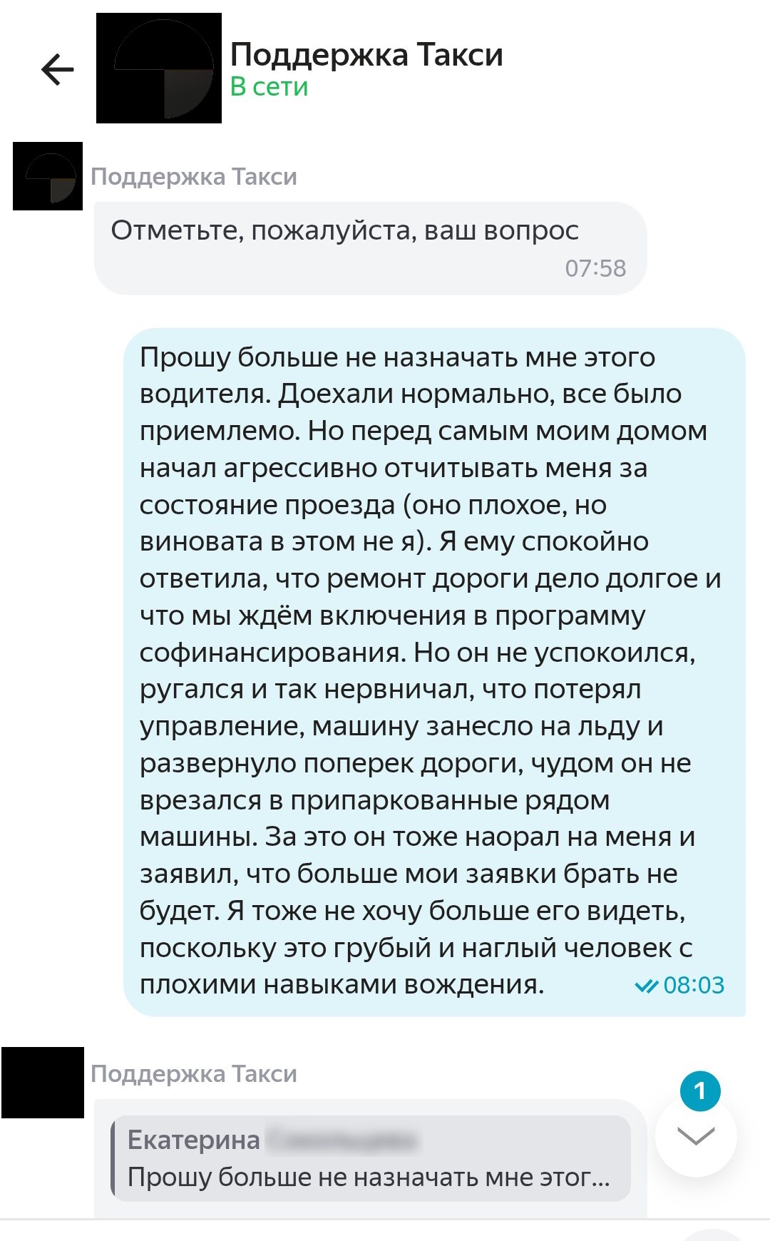 «Я ему тоже утром оставила одну звезду, считаю, таким водителям нечего делать на улицах, — говорит Екатерина. — Я понимаю, все сейчас на нервах из-за этого ужаса, постоянно везде скользко, каждый день люди руки и ноги ломают, в ДТП попадают. Но если ты не можешь справляться со стрессом и винишь в состоянии дорог пассажиров — тебе в такси точно не место».