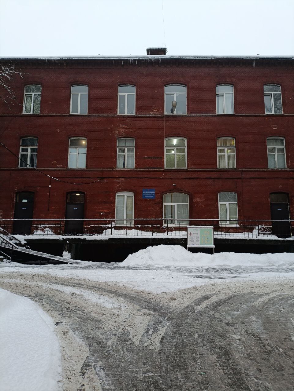 У здания всё в снегу, есть только несколько узких тропок, протоптанных пешеходами. Рядом — снежная каша и лёд. Часть тротуаров огорожена от сосулек и снега с крыш.