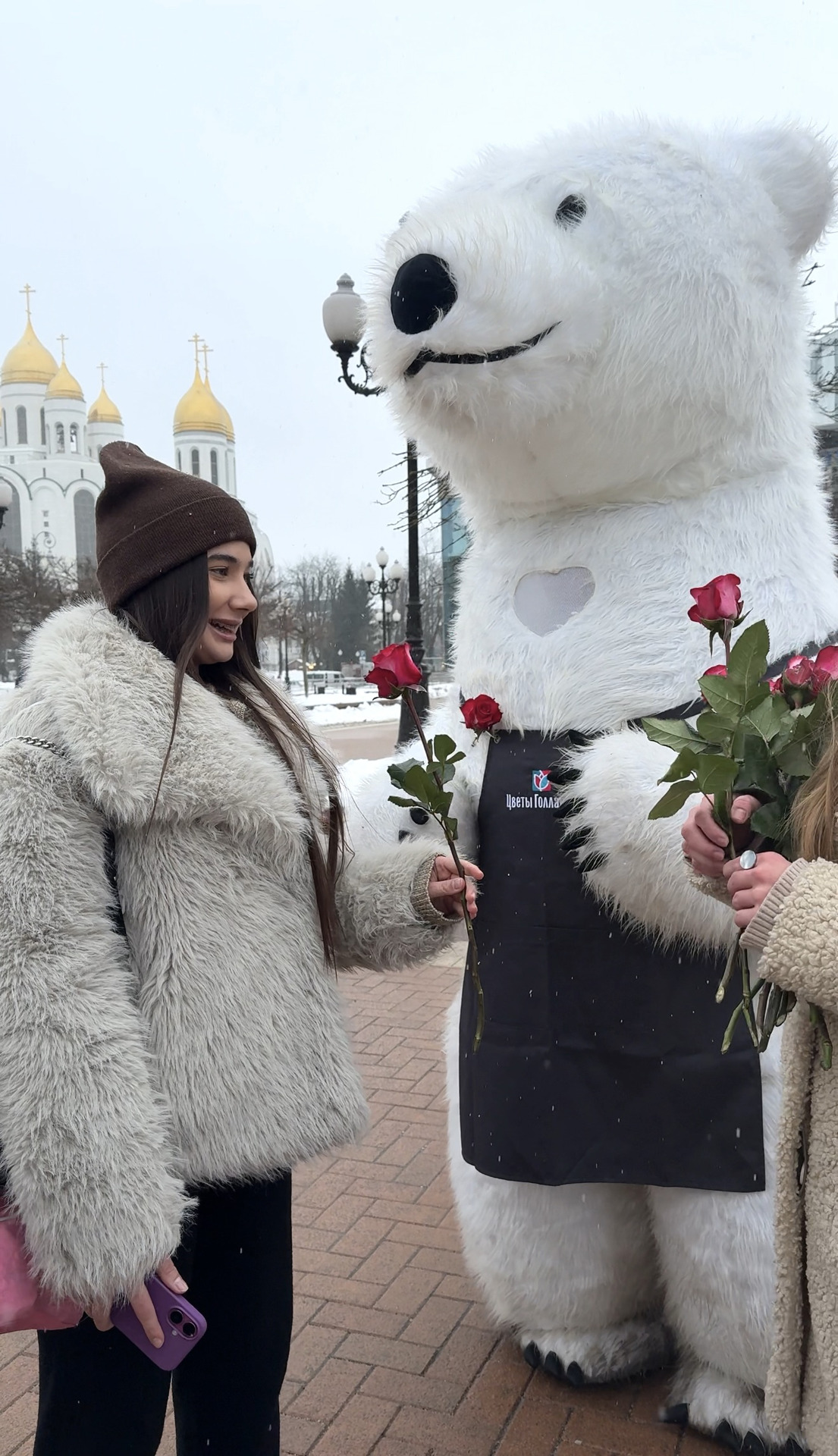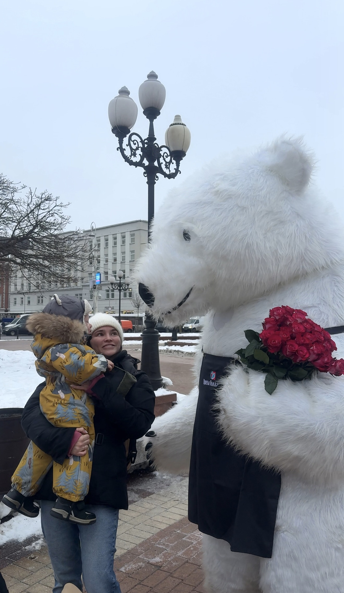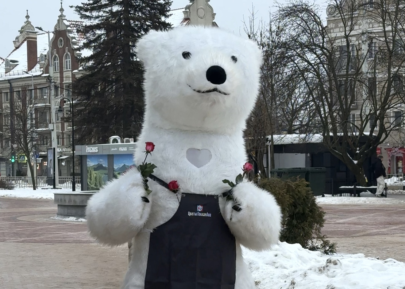 В центре города заметили загадочного большого белого медведя, который дарит прохожим улыбки, объятия и приятное предложение в преддверии 14 февраля.