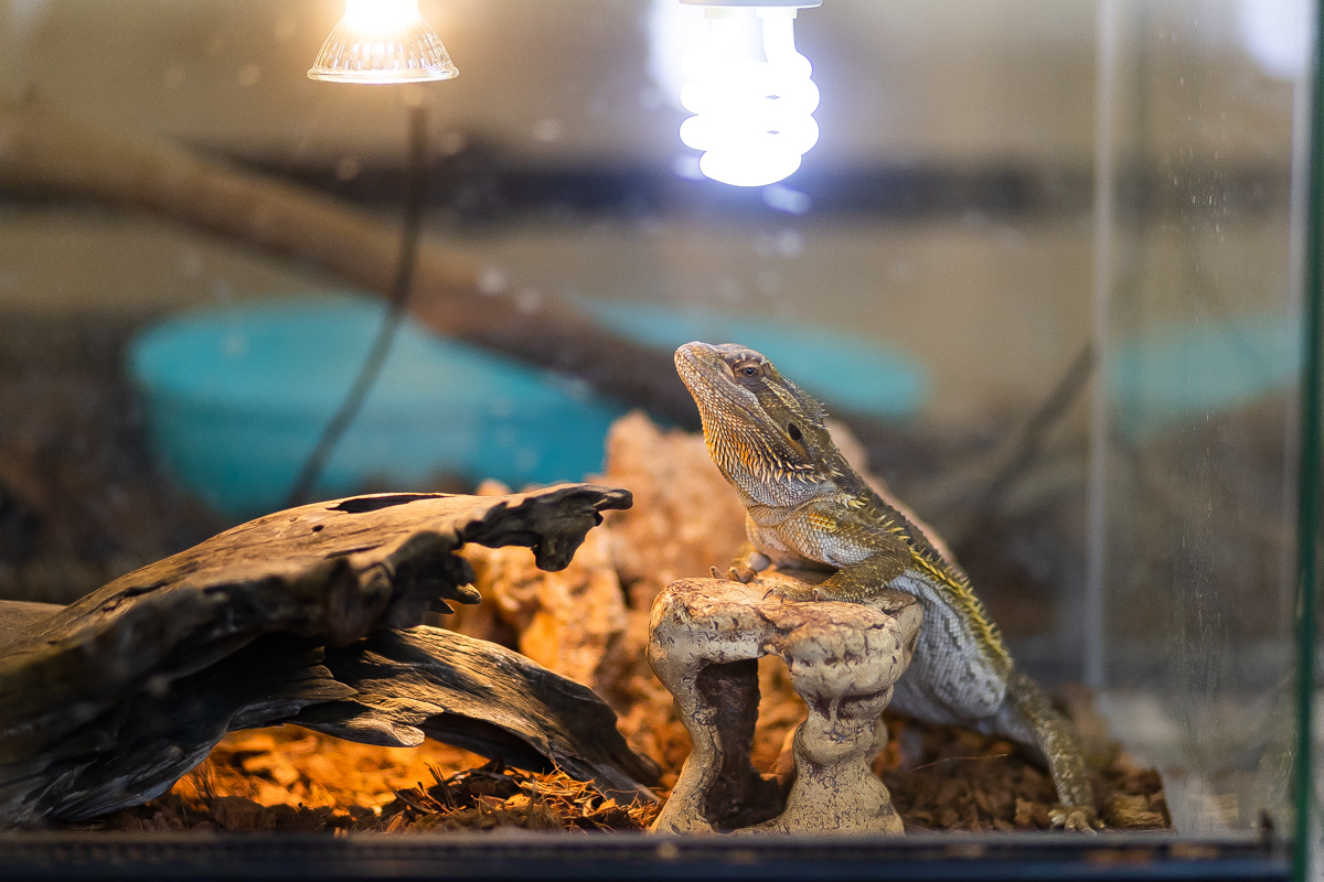 Рядом — самец Финик, он находится на передержке, пока хозяин в командировке. У агамы нет нескольких пальцев на лапах: это следствие неправильной линьки или того, что в детстве его держали с другими агамами и те просто откусили Финику пальцы. Его держат в закрытой тряпочкой вольере, потому что при виде Бусинки он начинает волноваться.