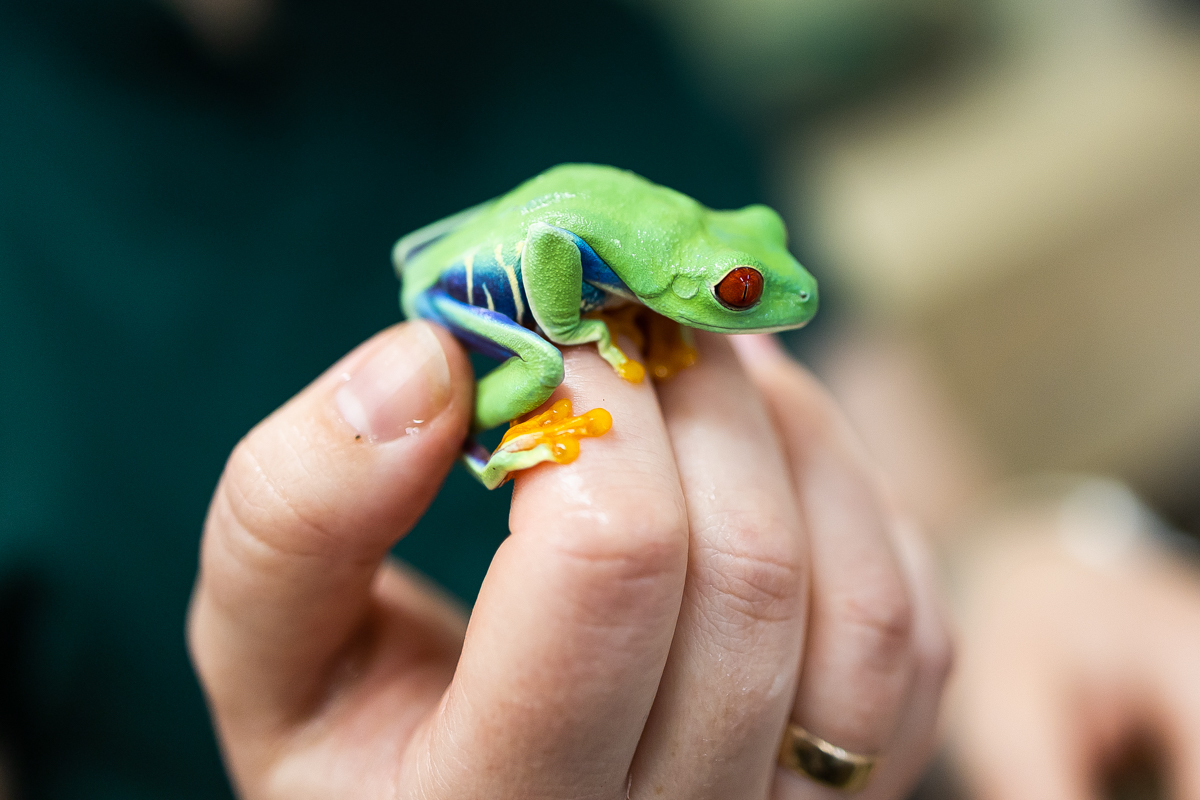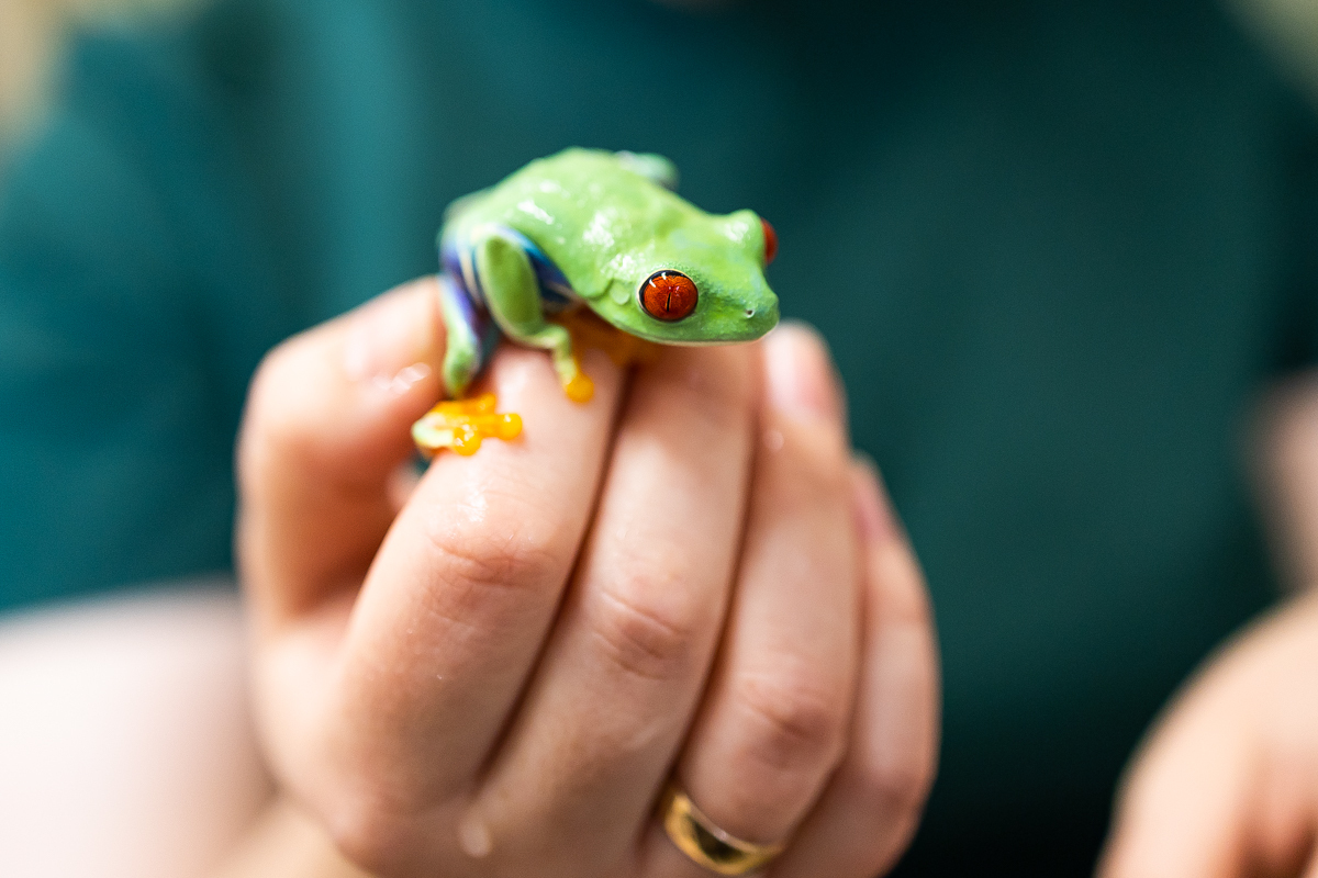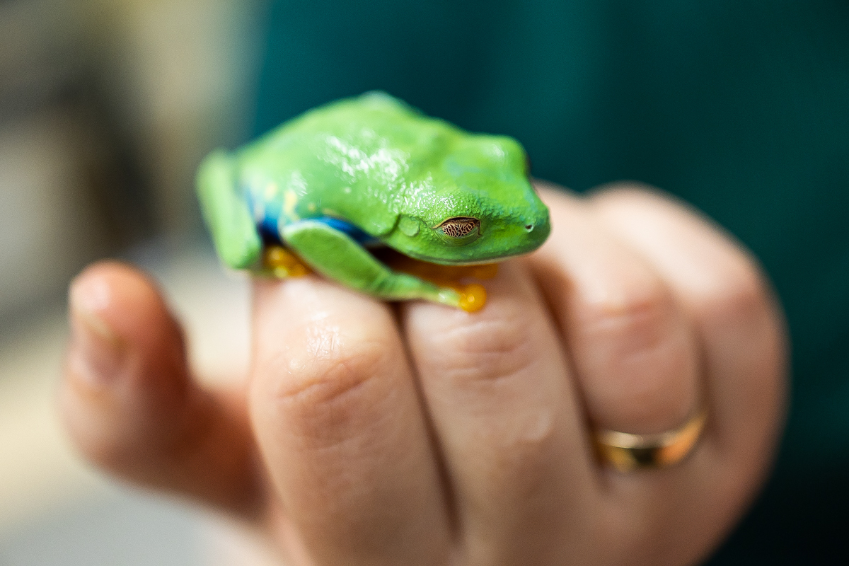 Красноглазая квакша Хлебушек никогда не ел сам. Маргарита рассказывает, что аккуратно открывает ему рот и засовывает туда вкусного сверчка.