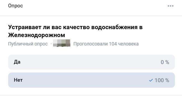 Но в реальности людям не до смеха. В опросе «Устраивает ли вас качество водоснабжения в Железнодорожном», который они сейчас проводят в соцсетях, вариант «Да» не выбрал ни один человек.