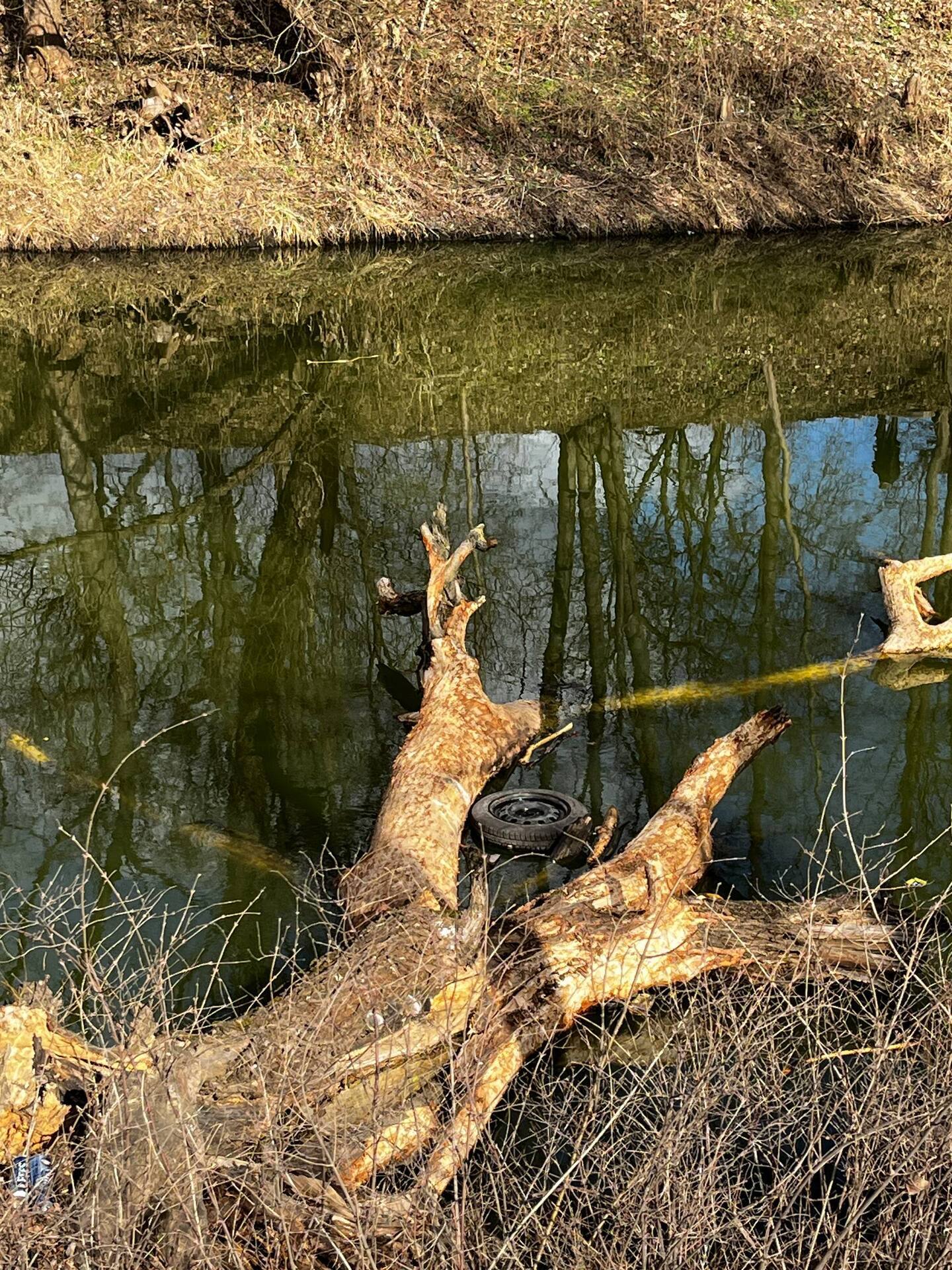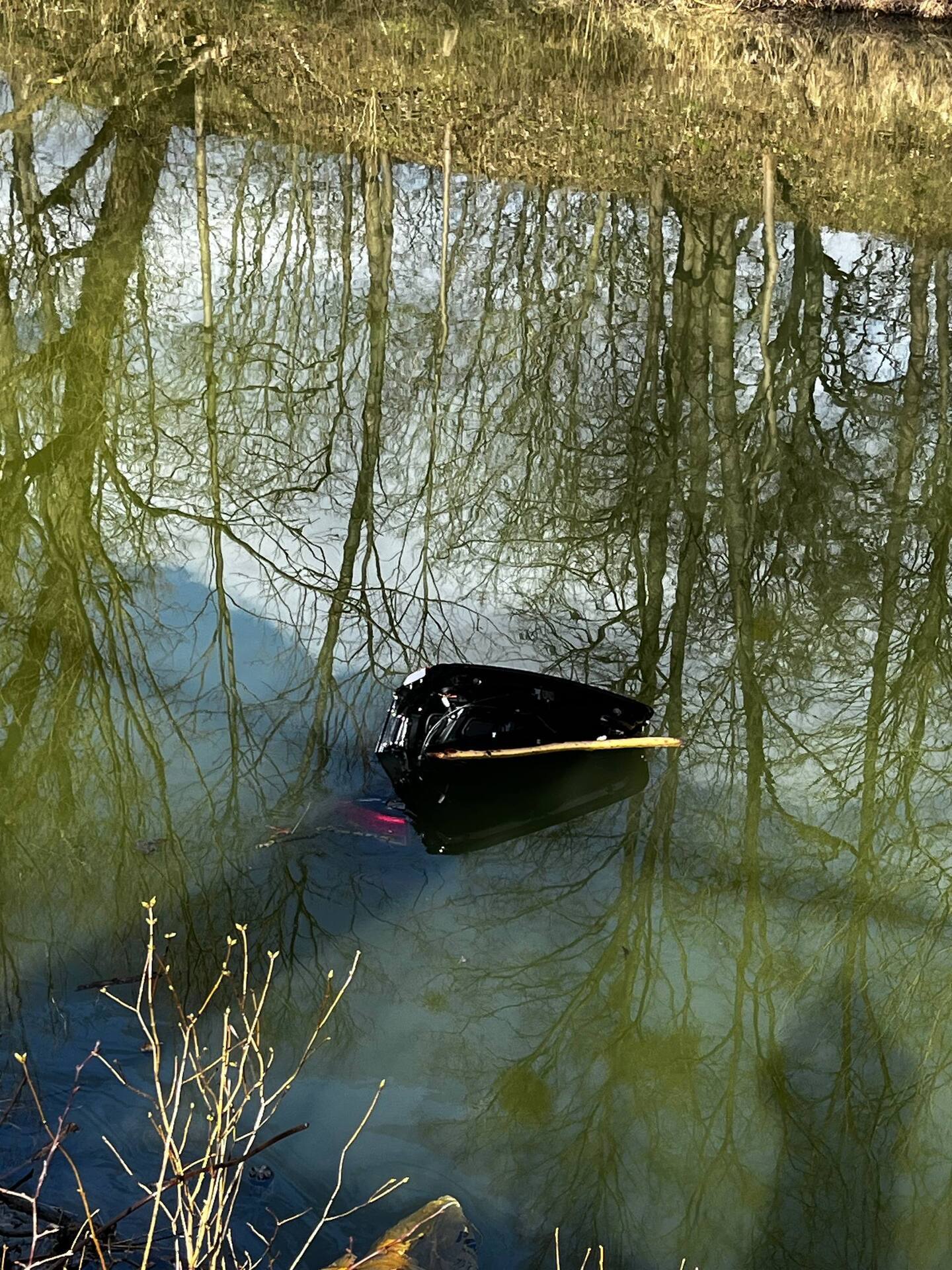 «Небольшая часть чёрной машины торчит над водой. Пробито дорожное ограждение, на коре дерева видны отметины от столкновения. Рядом никого нет», — сообщает очевидец.