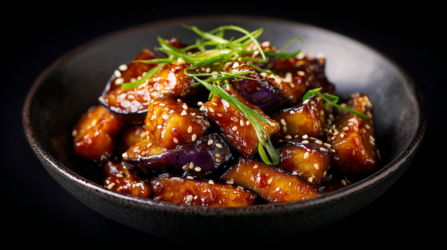 Для соуса смешать половину столовой ложки крахмала, кетчуп, соевый соус, сахар, уксус, мёд, апельсиновый сок и кунжут. Прогреть всё на сковороде, чтобы масса загустела. Полить соусом баклажаны. Готовое блюдо украсить свежей зеленью или посыпать кунжутом.
