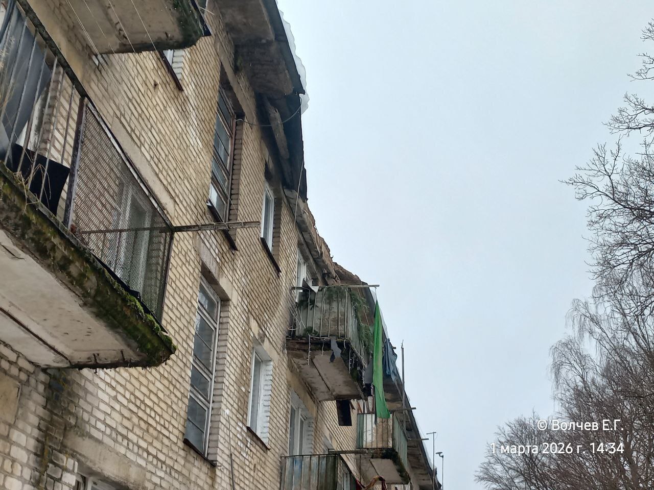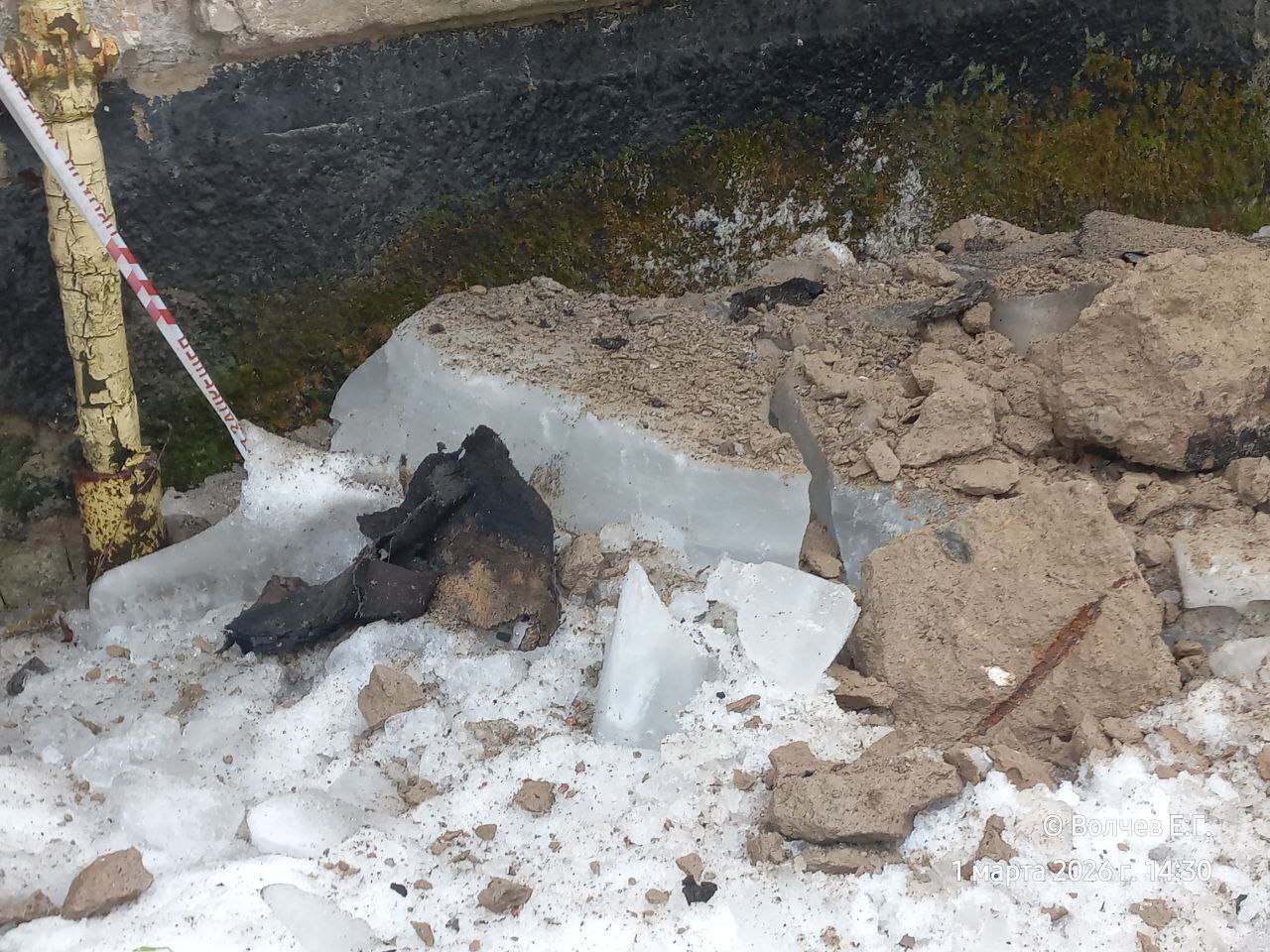 «Я услышал громкий шум со стороны трёхэтажки. Когда обернулся, увидел, как от крыши отделился фрагмент перекрытия размером в несколько метров. Он полетел вниз, а следом за этим куском бетона — большие глыбы льда. Вся эта масса обрушилась на балкон квартиры на третьем этаже, а часть бетонных конструкций грохнулась прямо у входа в подъезд», — рассказывает мужчина.
