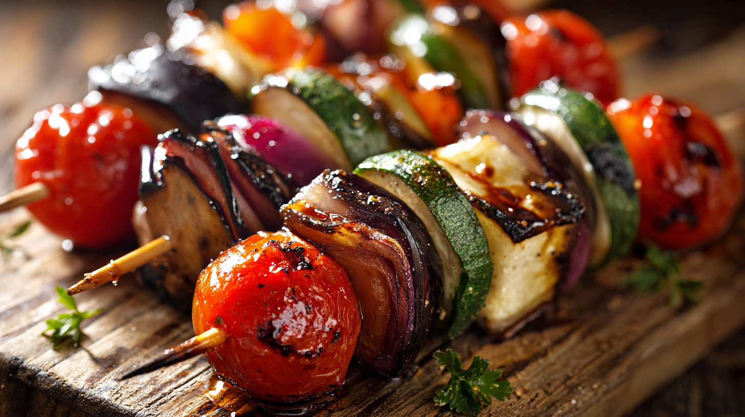 Жарить на расстоянии около 10 см от углей по 3–4 минуты с каждой стороны. Готовое блюдо можно подавать прямо на шампурах или переложить все овощи в миску, чтобы получился тёплый салат. Для заправки подойдут оливковое масло, йогурт с чесноком, соусом ткемали или остро-сладким.