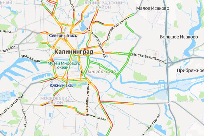 Движение затруднено на основных магистралях города, в том числе на Горького, Портовой, Железнодорожной, Гагарина, Невского, Черняховского, Фрунзе, 9 Апреля, Ленинском, Московском и Советском проспектах. Сообщается об одной аварии — Московском проспекте. Общая ситуация в Калининграде оценивается в семь баллов.