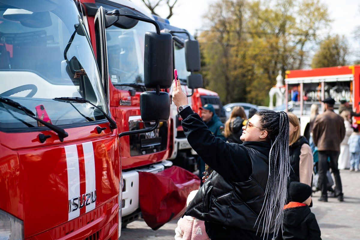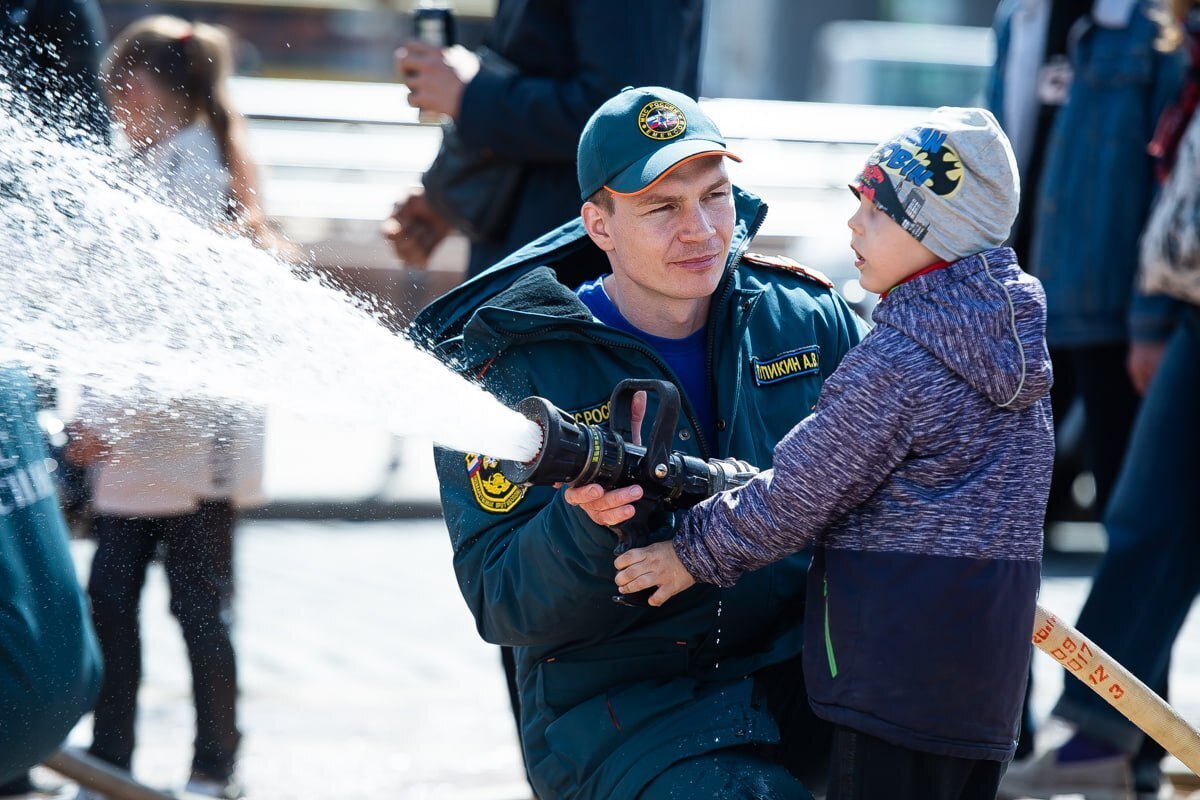 Программу для горожан подготовили насыщенную. Можно было не только смотреть со стороны, но и почувствовать себя пожарным: примерить форму и пострелять водой из настоящего брандспойта.