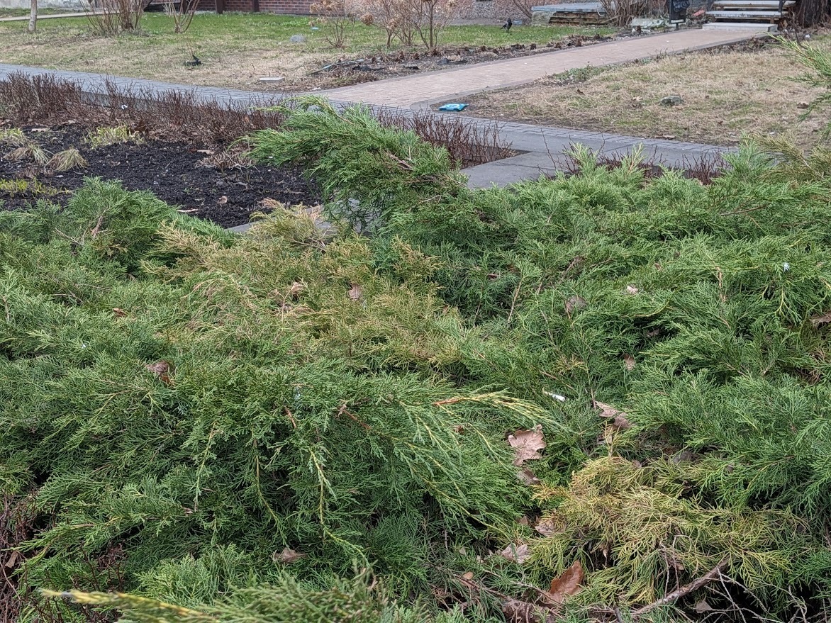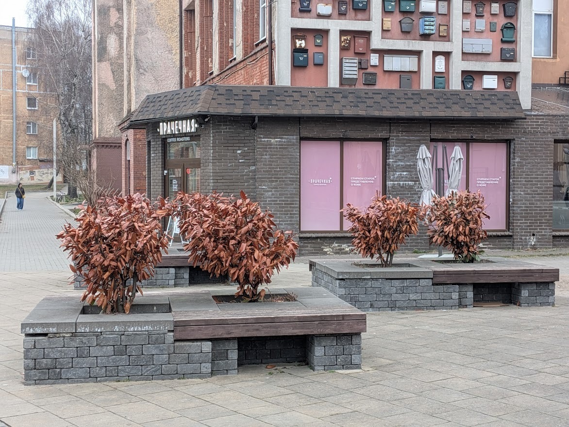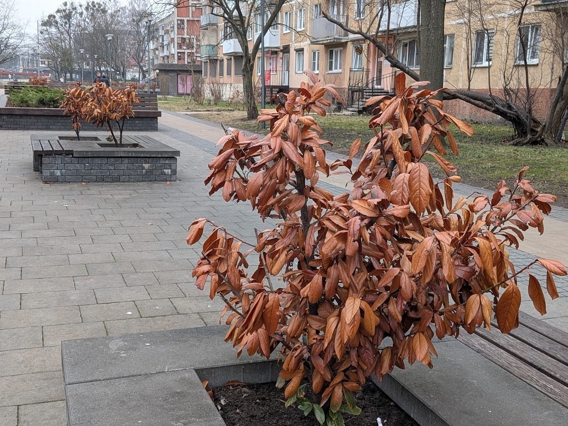 Декоративные растения в вазонах в пешеходной зоне на улице Рокоссовского в Калининграде выглядят после зимы пугающе. Ветки можжевельника местами пожелтели, вечнозелёные лавровишни сплошь покрыты сухой коричневой листвой. Ситуацию «Клопс» прокомментировала сити-менеджер Елена Дятлова во время пресс-подхода на рабочем выезде в пятницу, 20 марта.