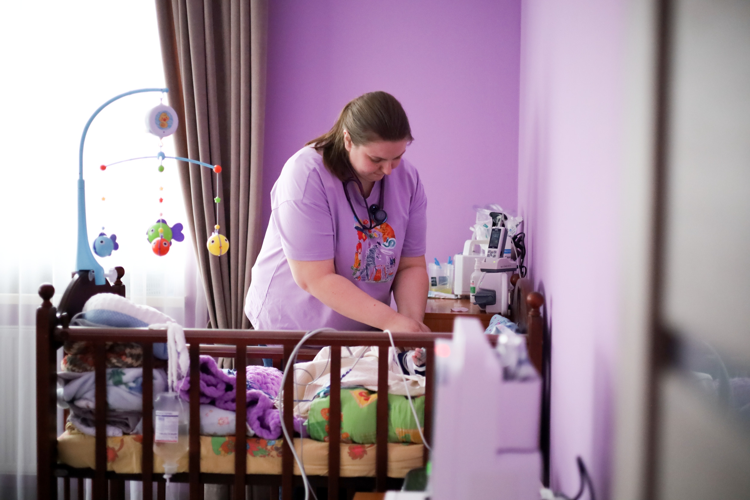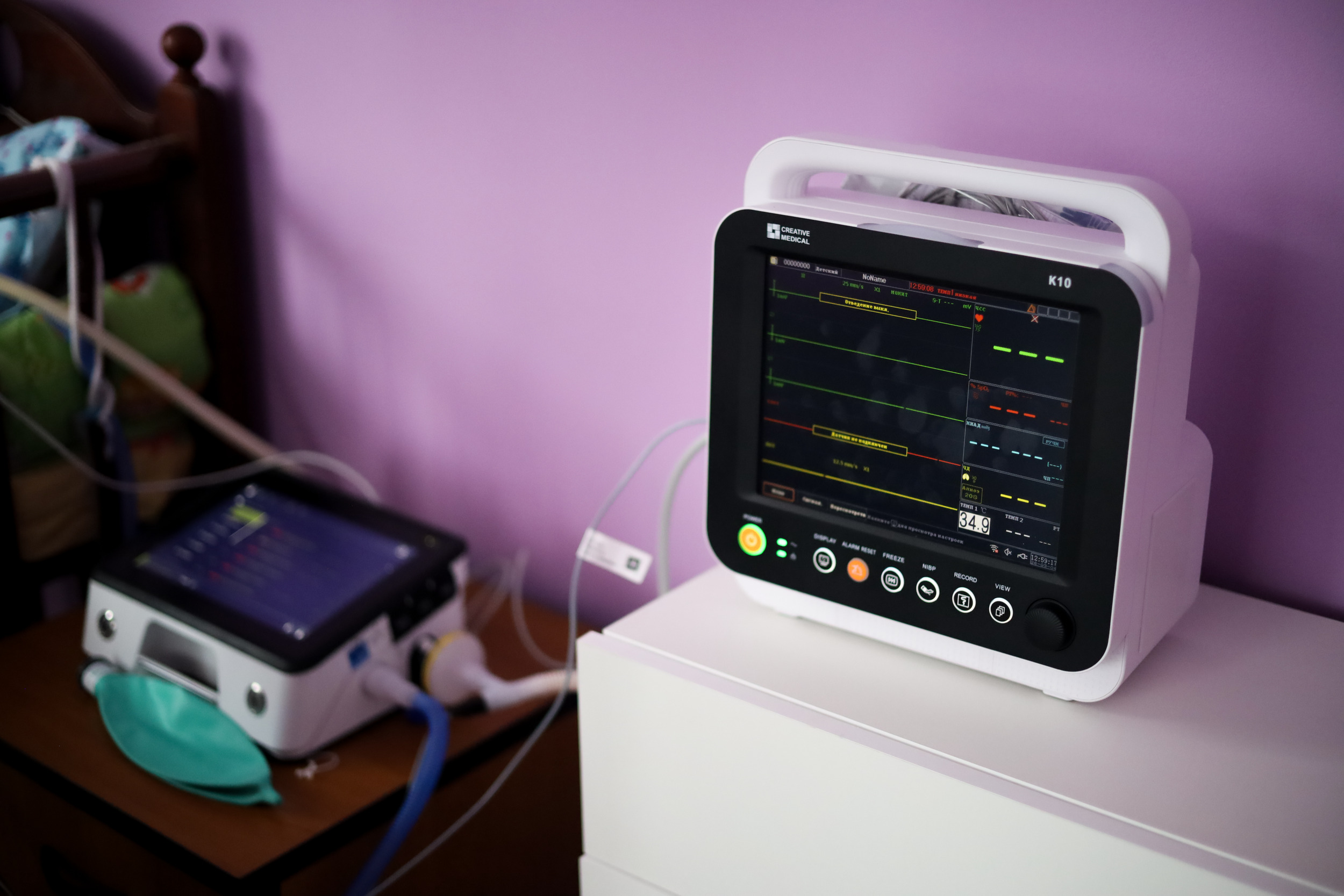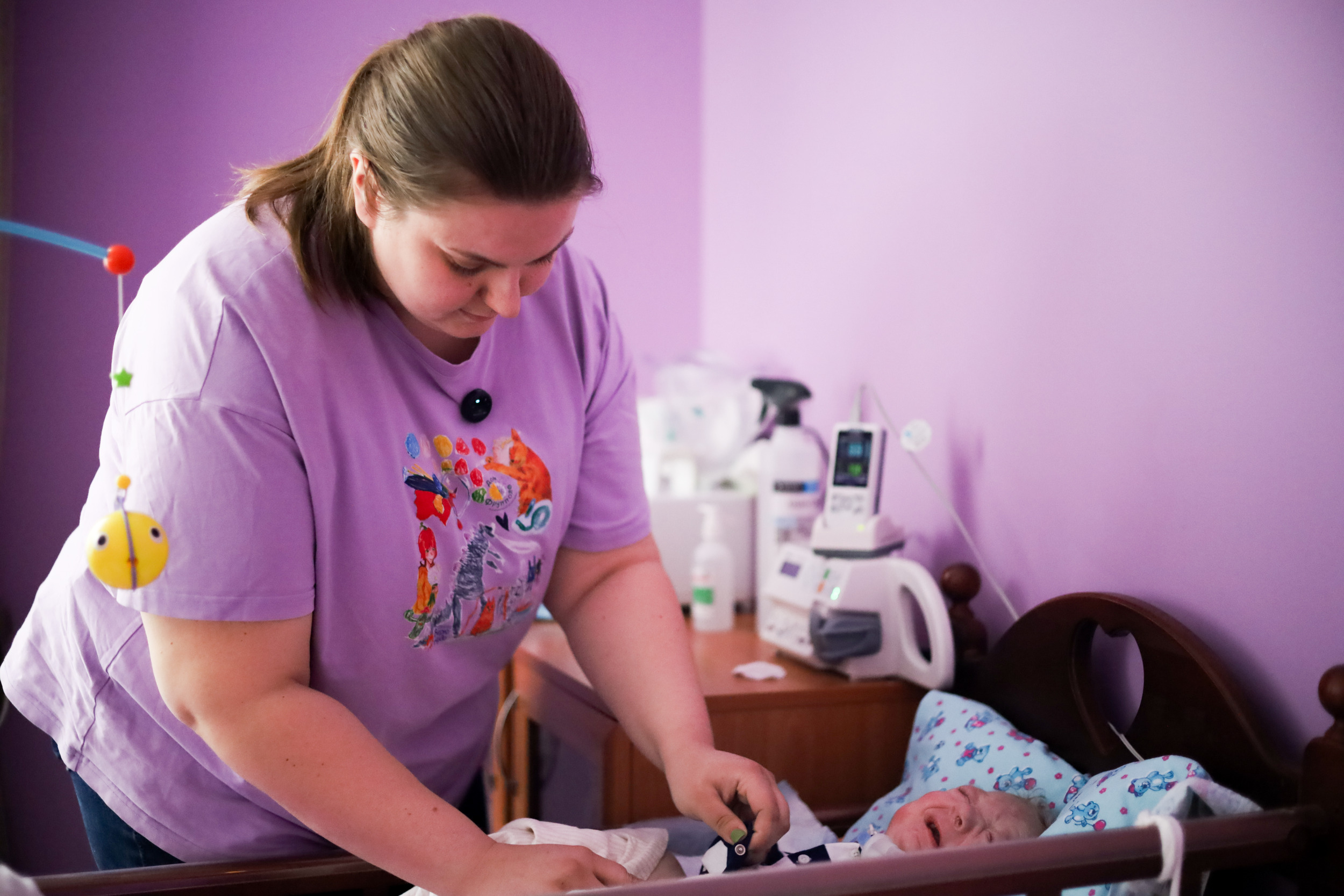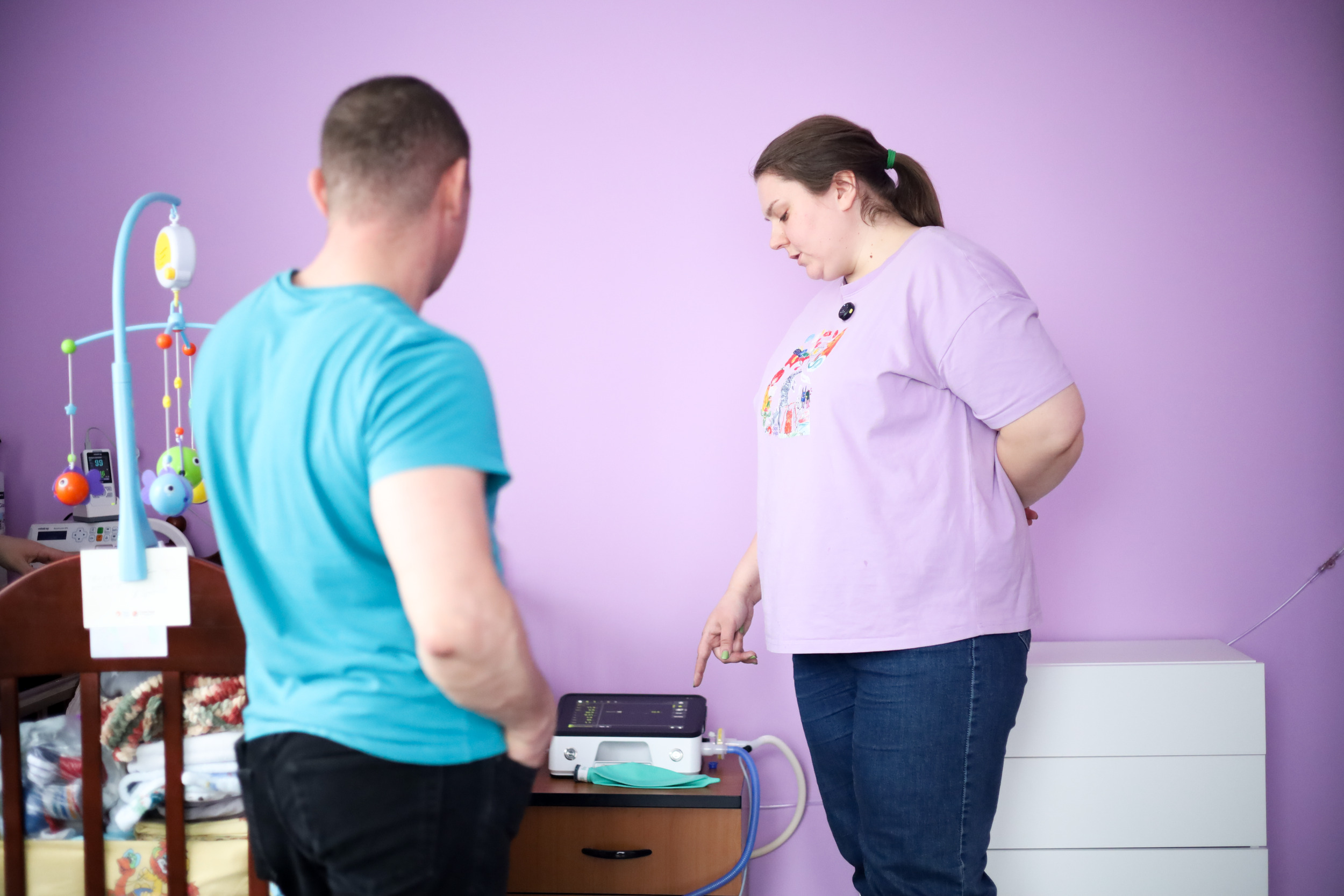 Анастасия умело подключает новый аппарат, ставит его у кроватки малыша. Гладит и успокаивает Давида, пока надевает ему на ручку манжету, измеряющую пульс. Всё это время рядом стоит мама: ей спокойно, потому что с ребёнком работает настоящий чуткий специалист.