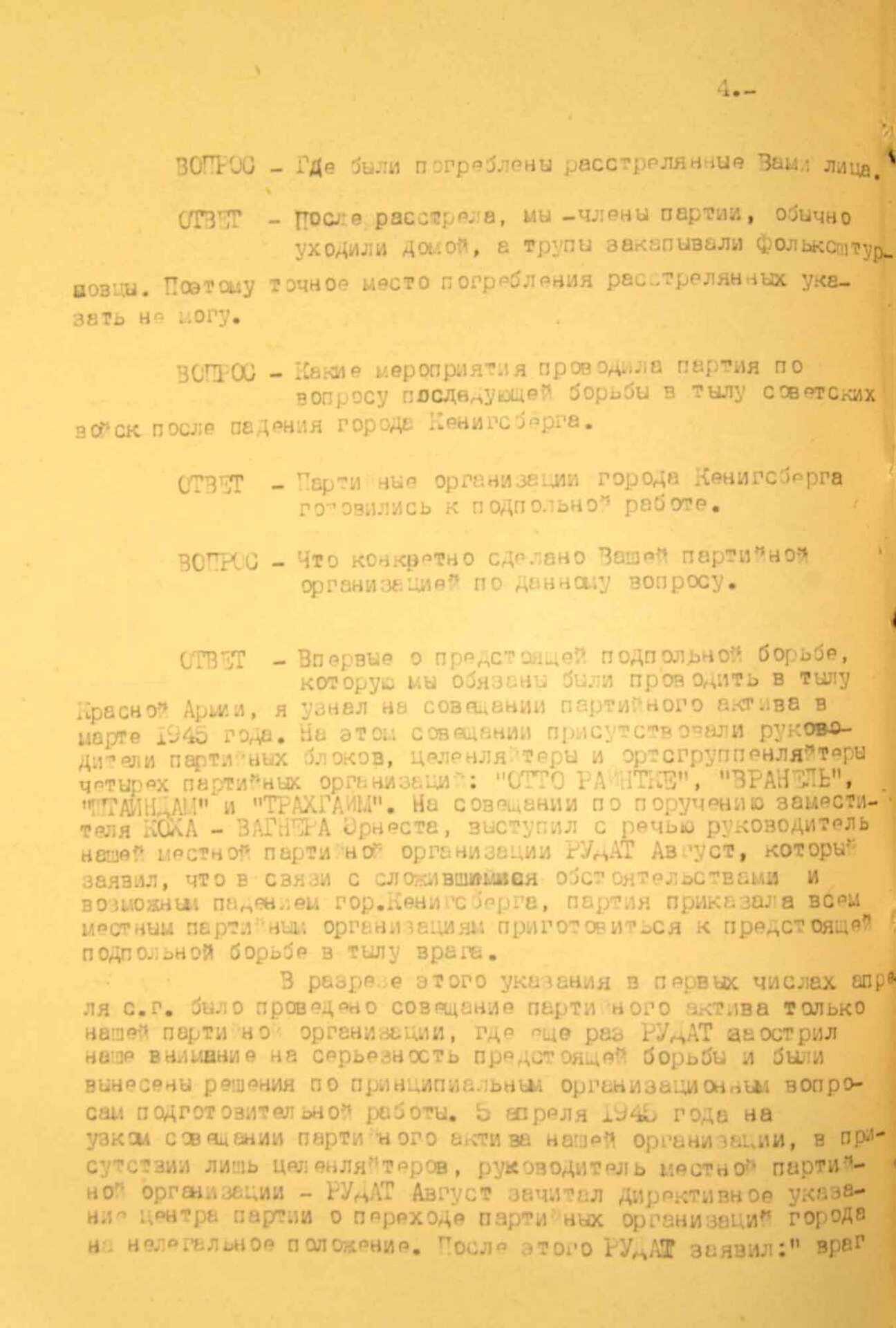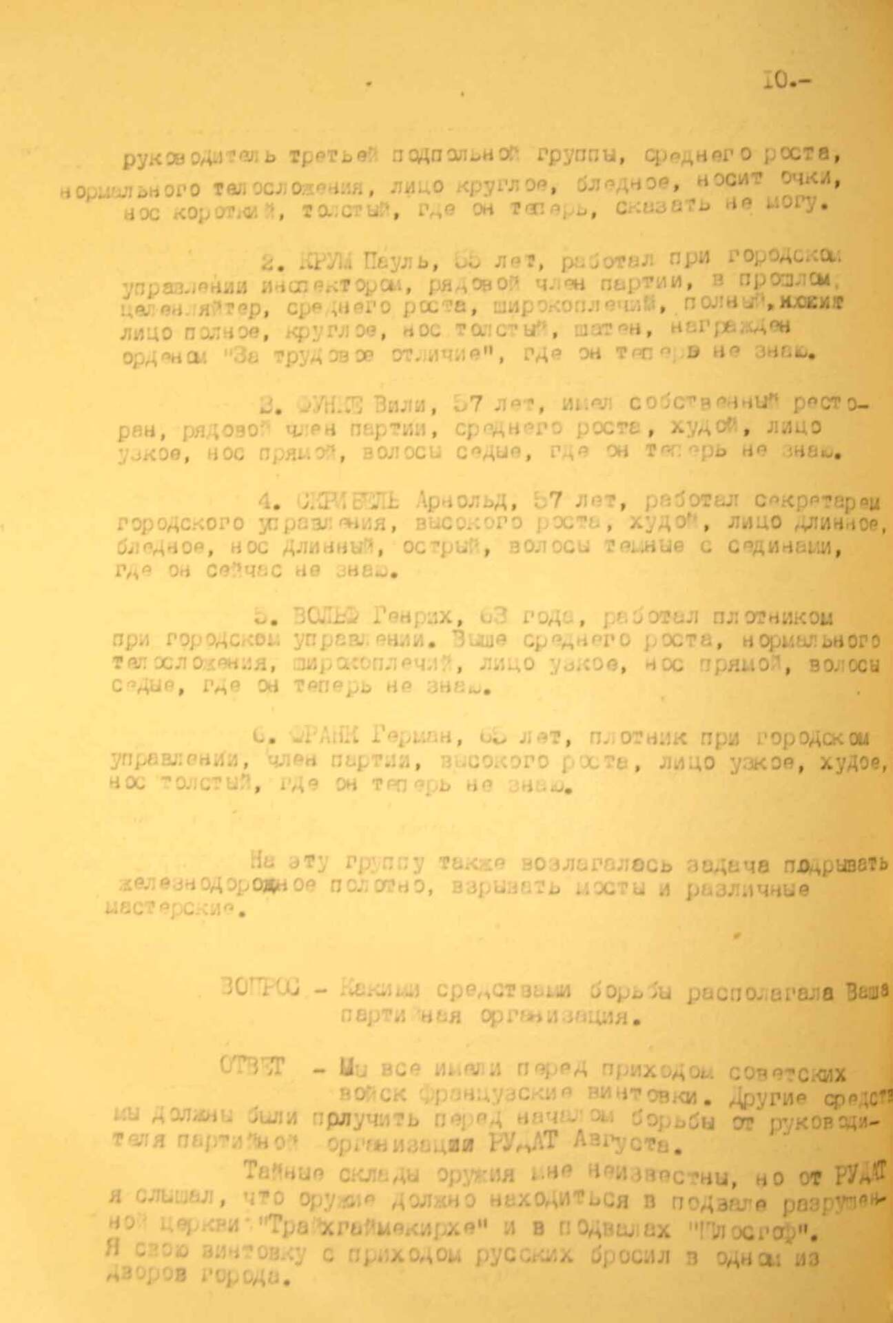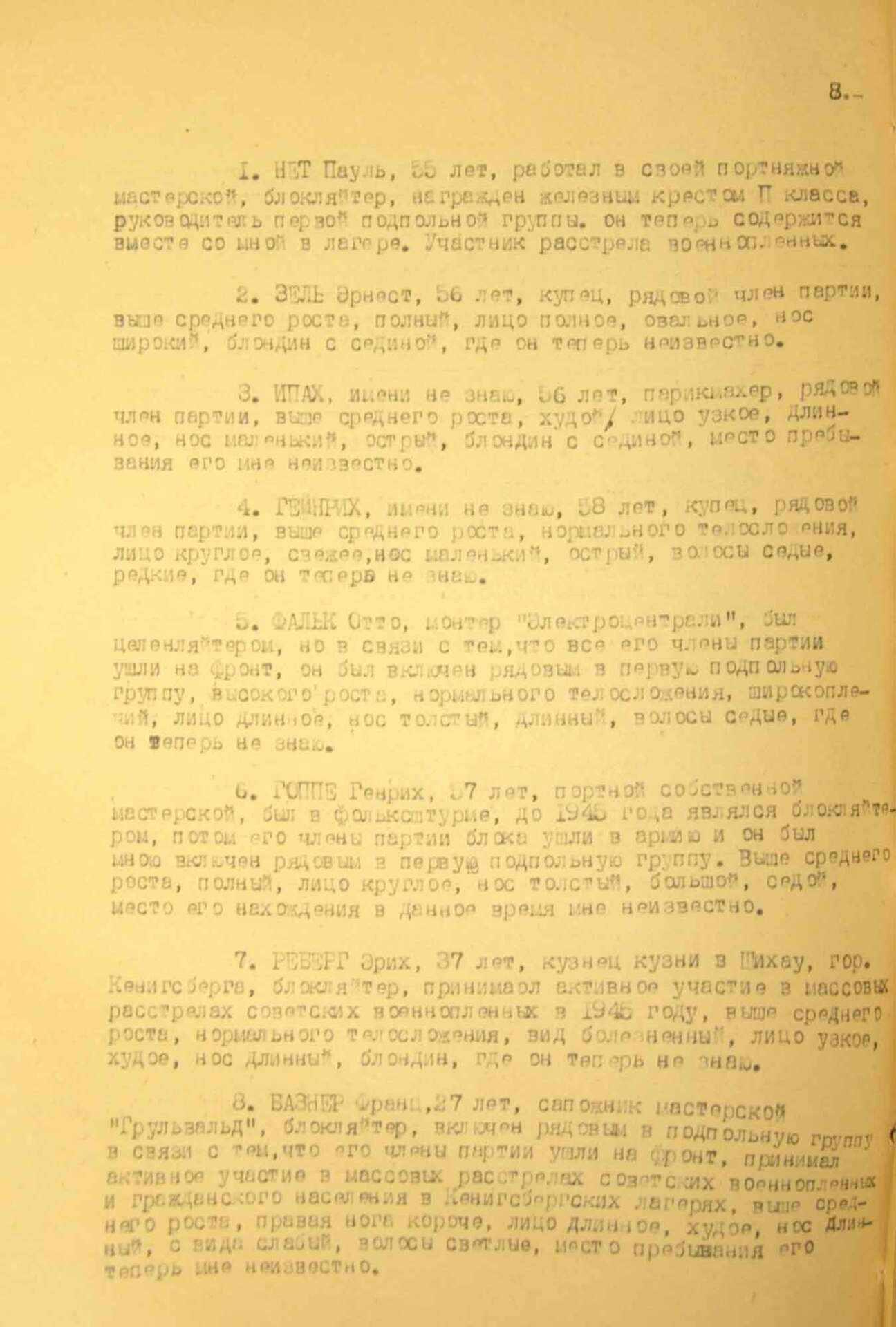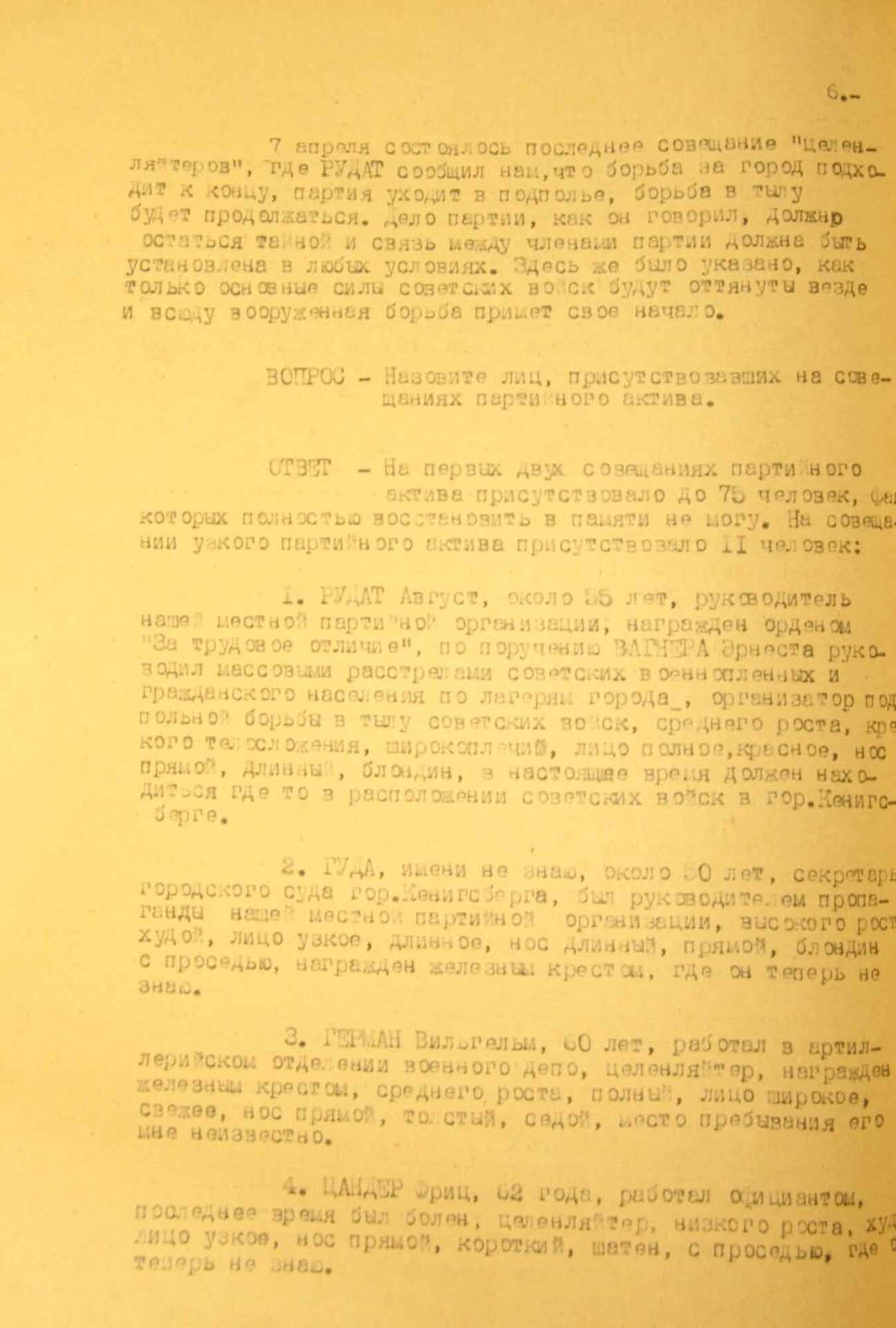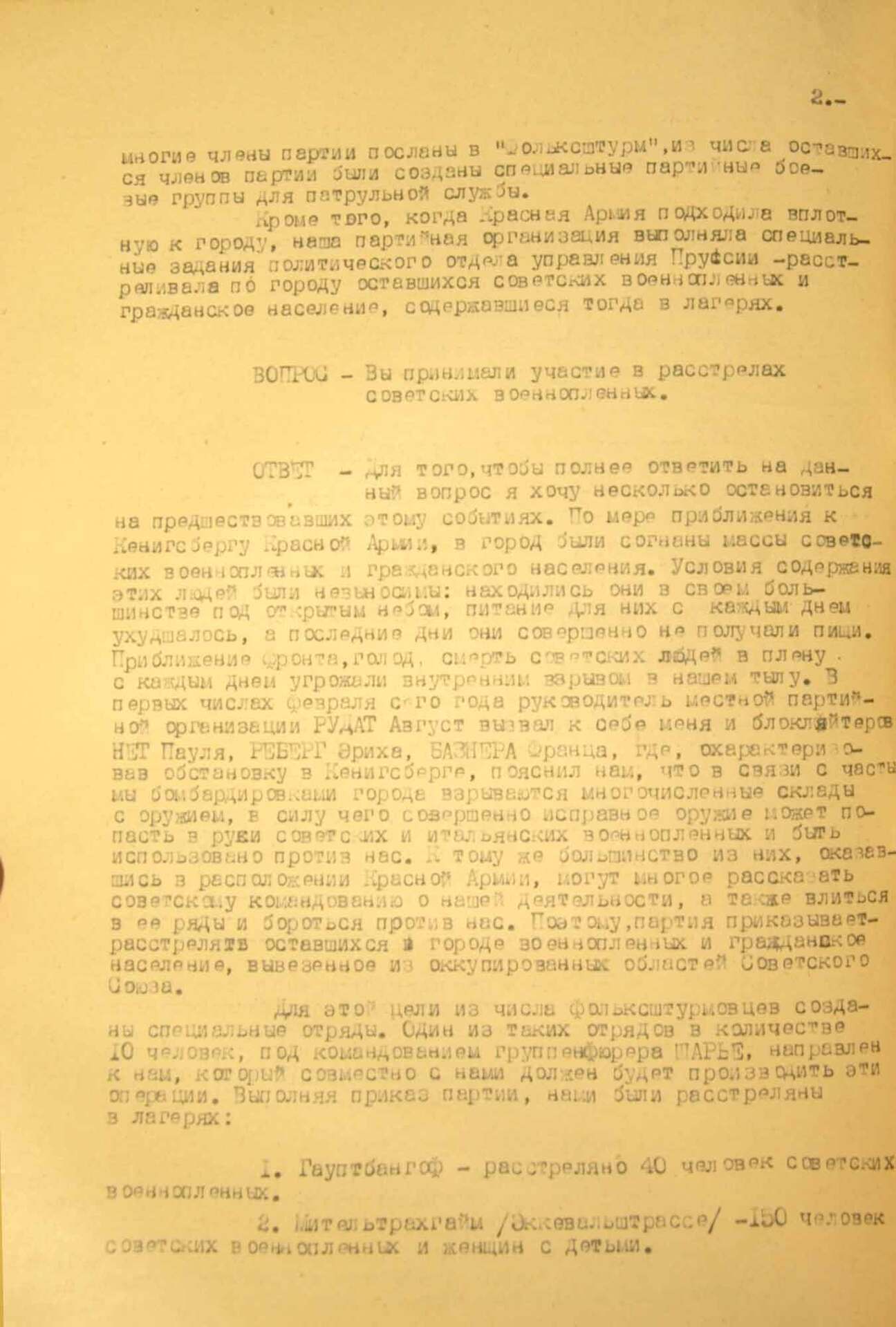 Как следует из опубликованных документов, одним из задержанных стал руководитель местной ячейки нацистской партии Отто Машон. На допросе он рассказал, что партийная организация выполняла спецзадания политического отдела управления Пруссии и участвовала в расстрелах военнопленных и гражданского населения, которое содержалось в лагерях.
