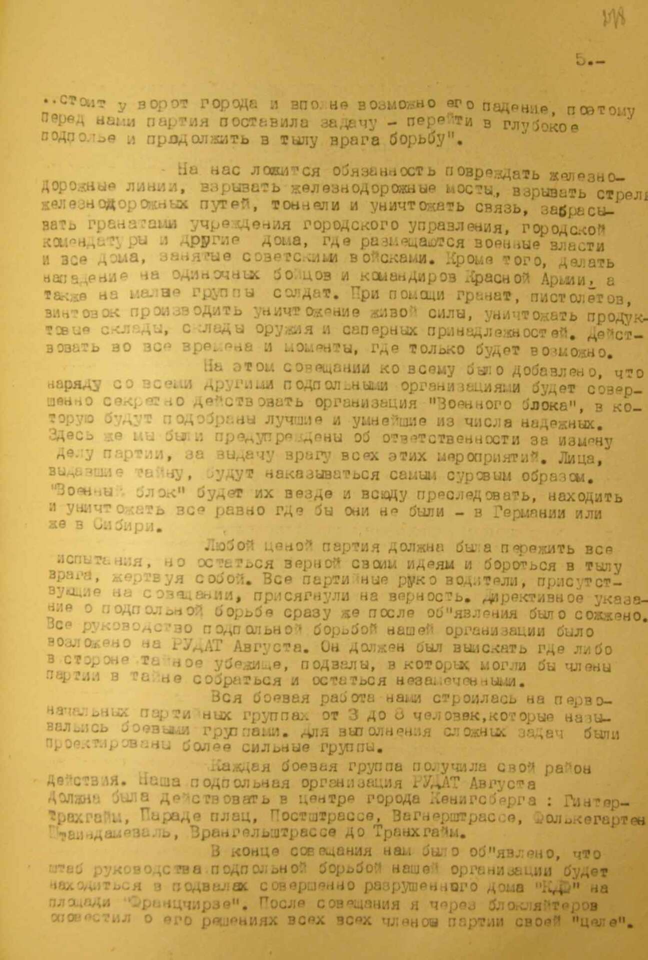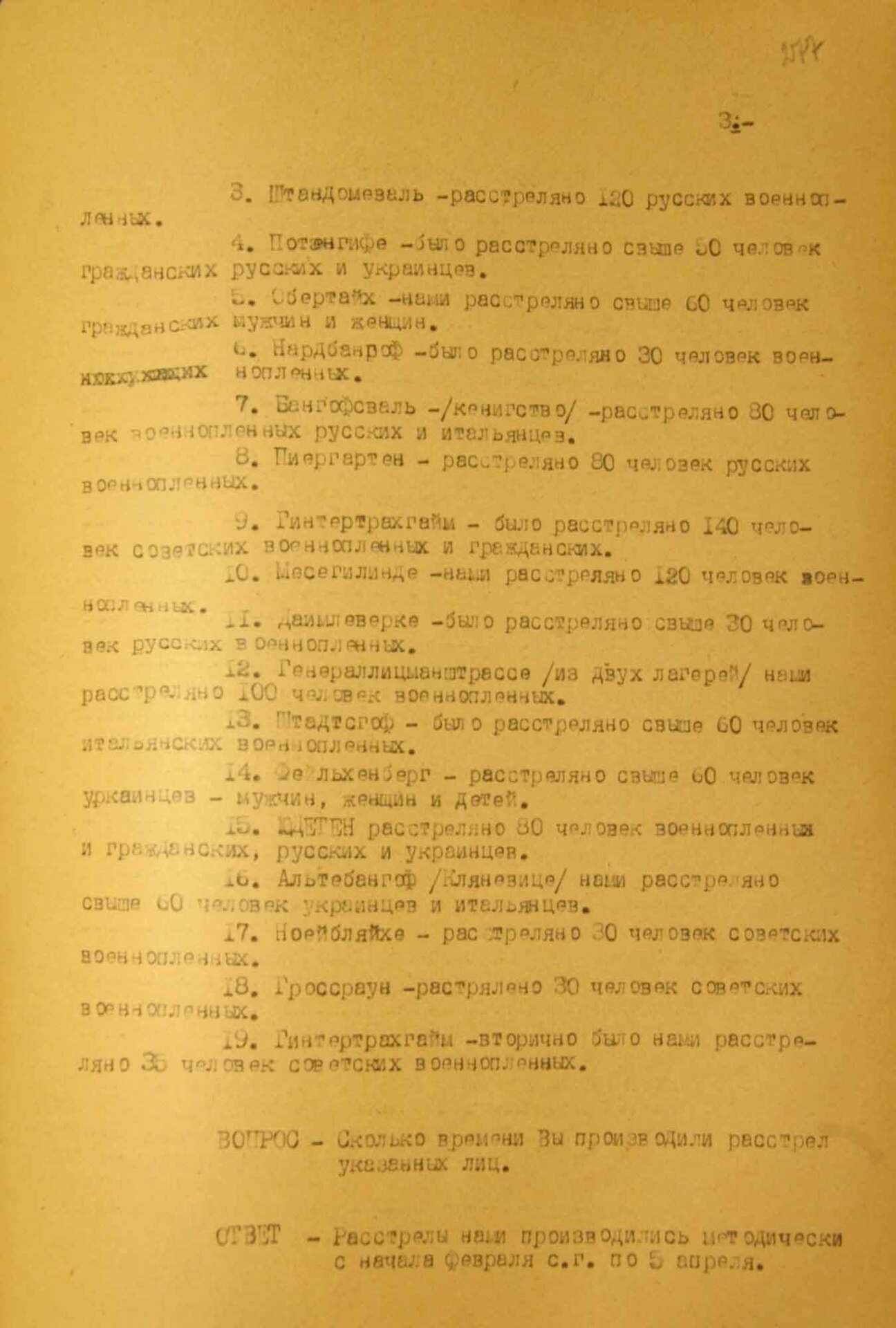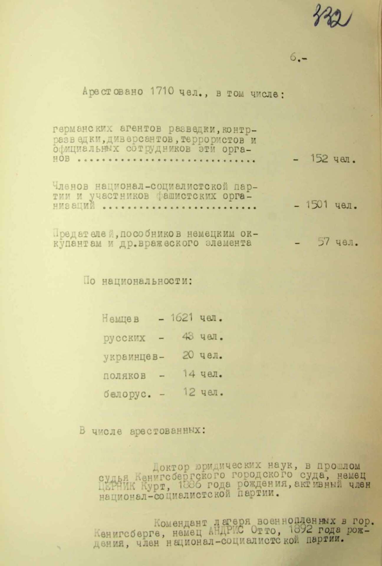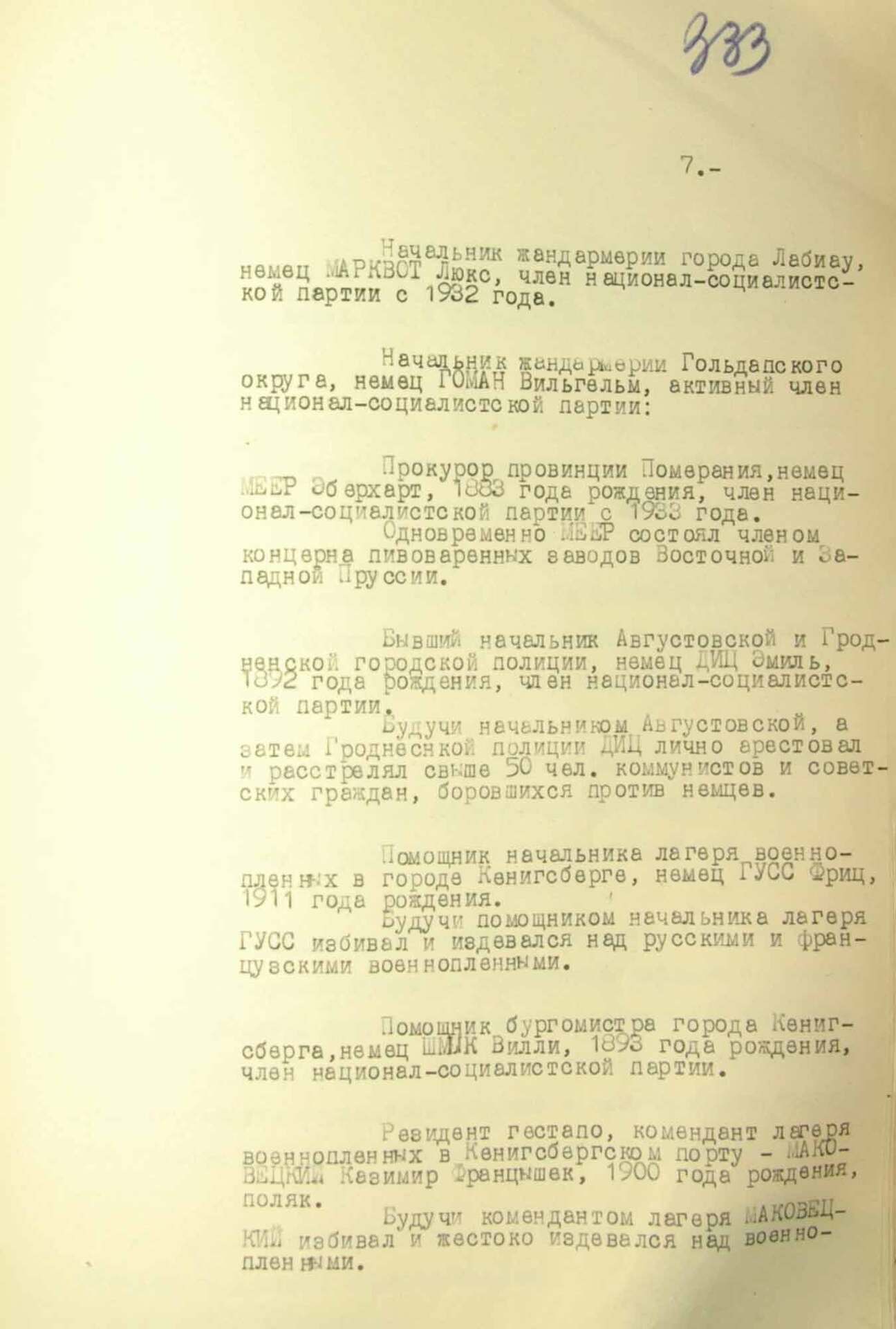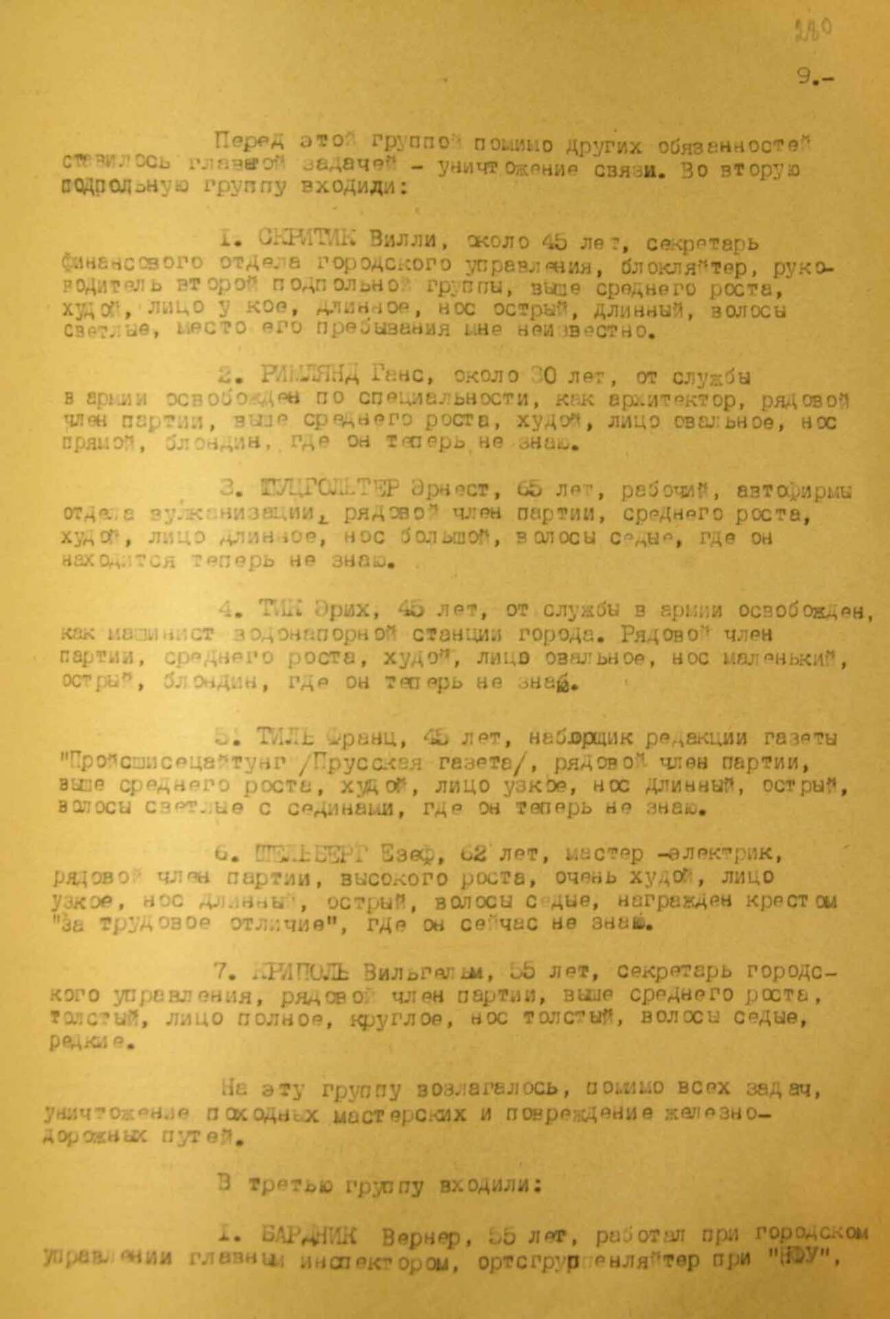 Как следует из опубликованных документов, одним из задержанных стал руководитель местной ячейки нацистской партии Отто Машон. На допросе он рассказал, что партийная организация выполняла спецзадания политического отдела управления Пруссии и участвовала в расстрелах военнопленных и гражданского населения, которое содержалось в лагерях.