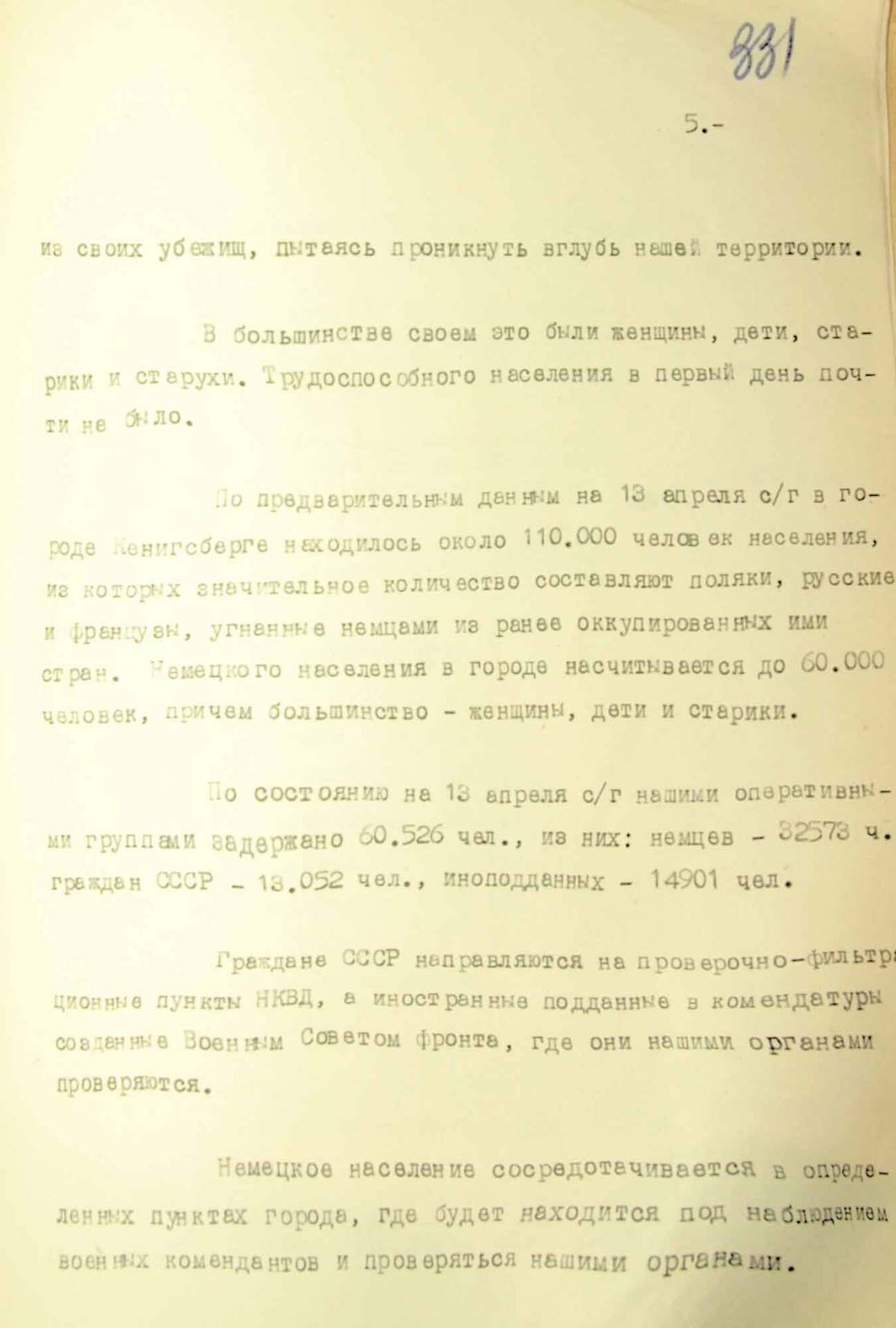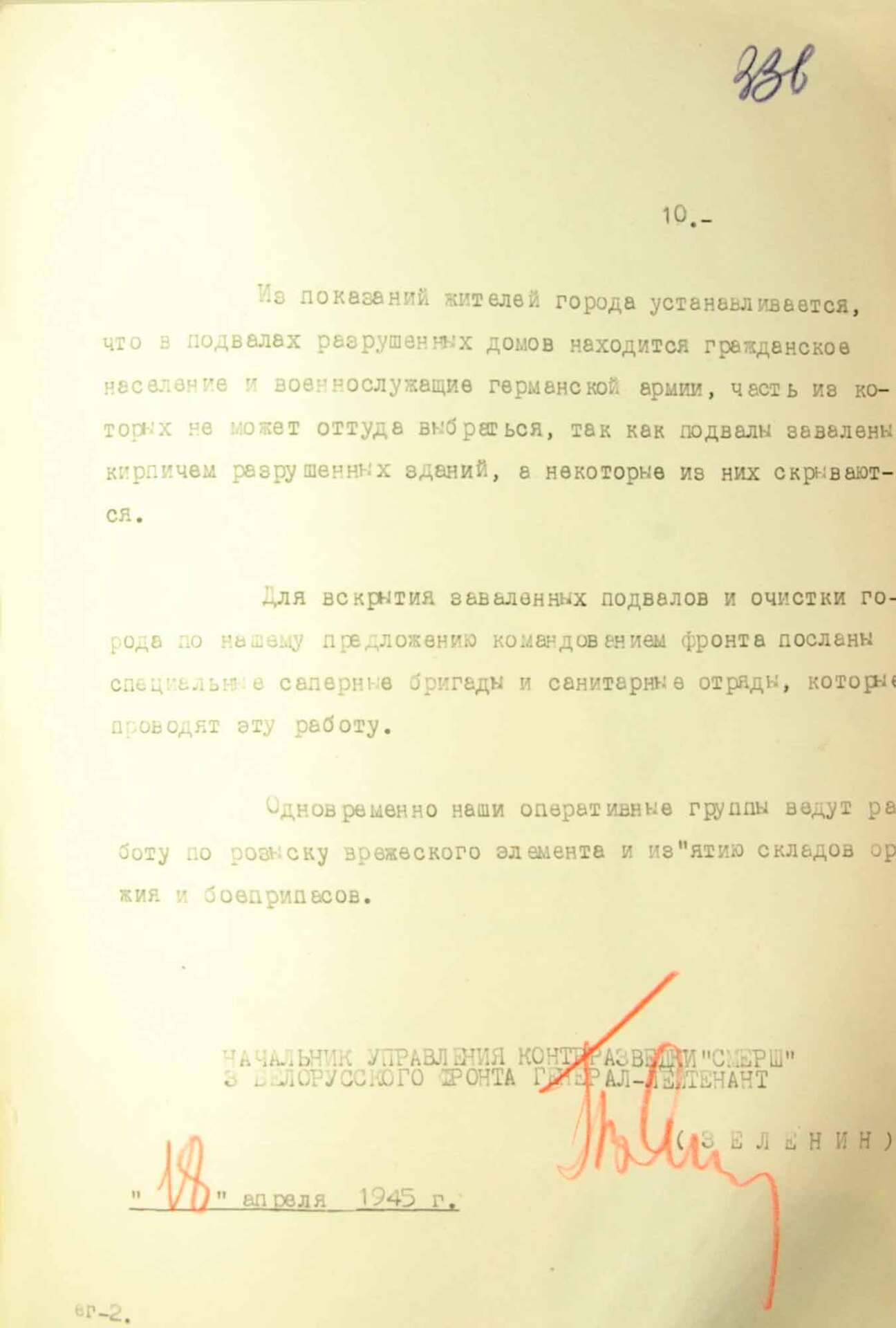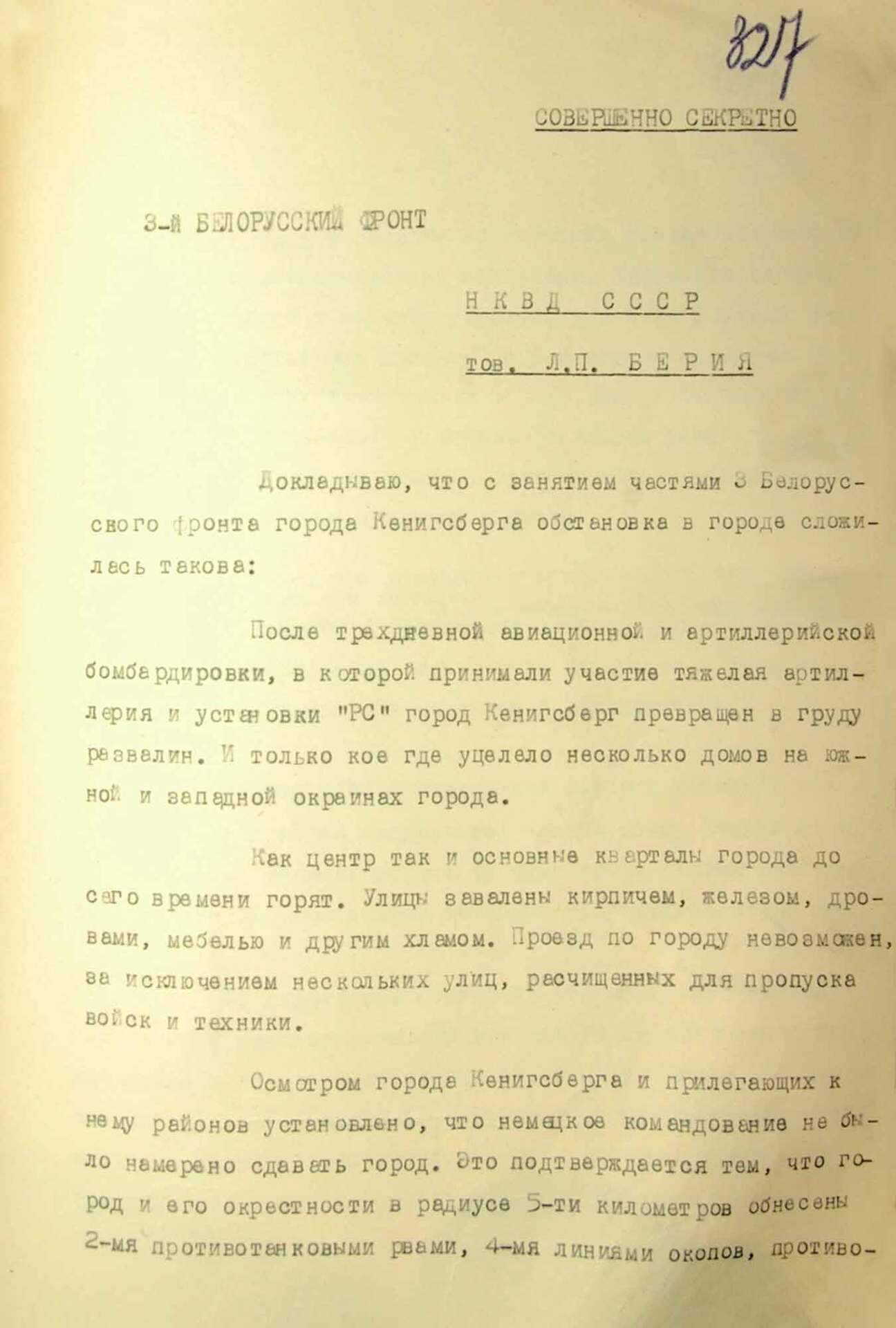 Докладная записка начальника УКР «Смерш» 3-го Белорусского фронта генерал-лейтенанта Павла Зеленина наркому внутренних дел СССР генеральному комиссару госбезопасности Лаврентию Берии о положении в Кёнигсберге. 18 апреля 1945 года. Кёнигсберг
