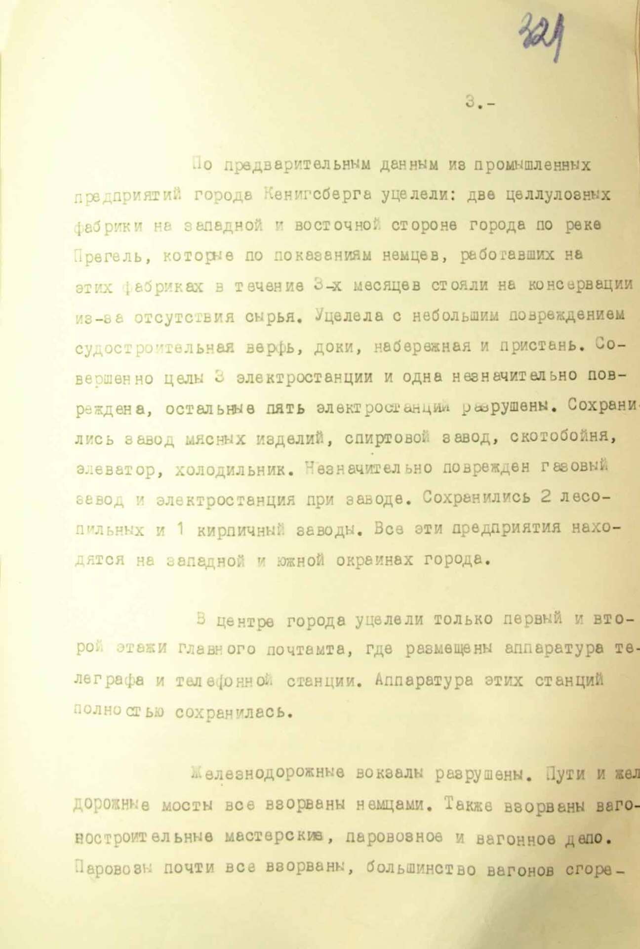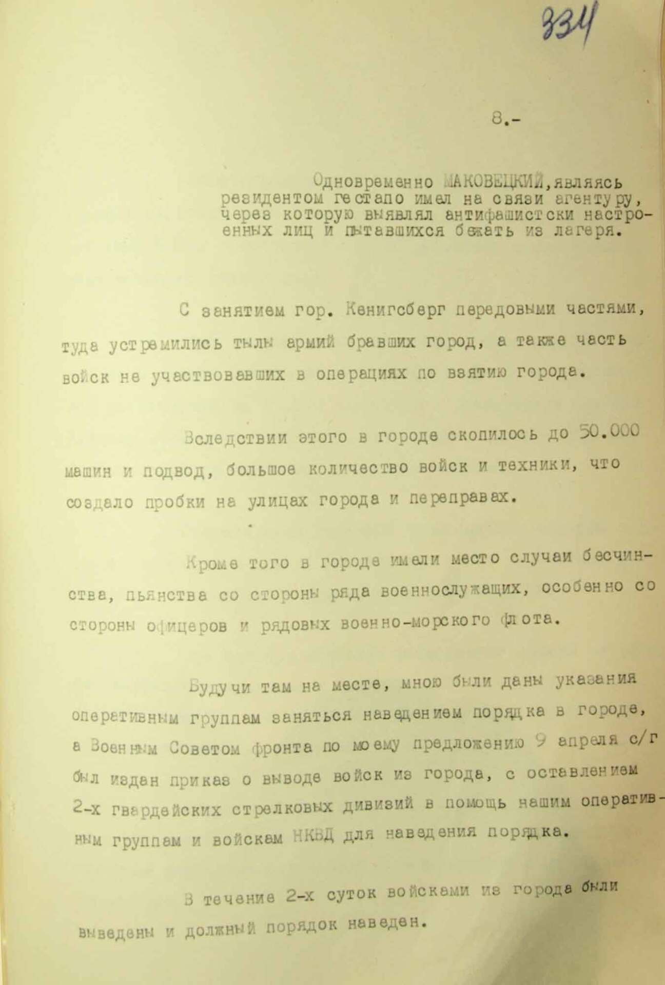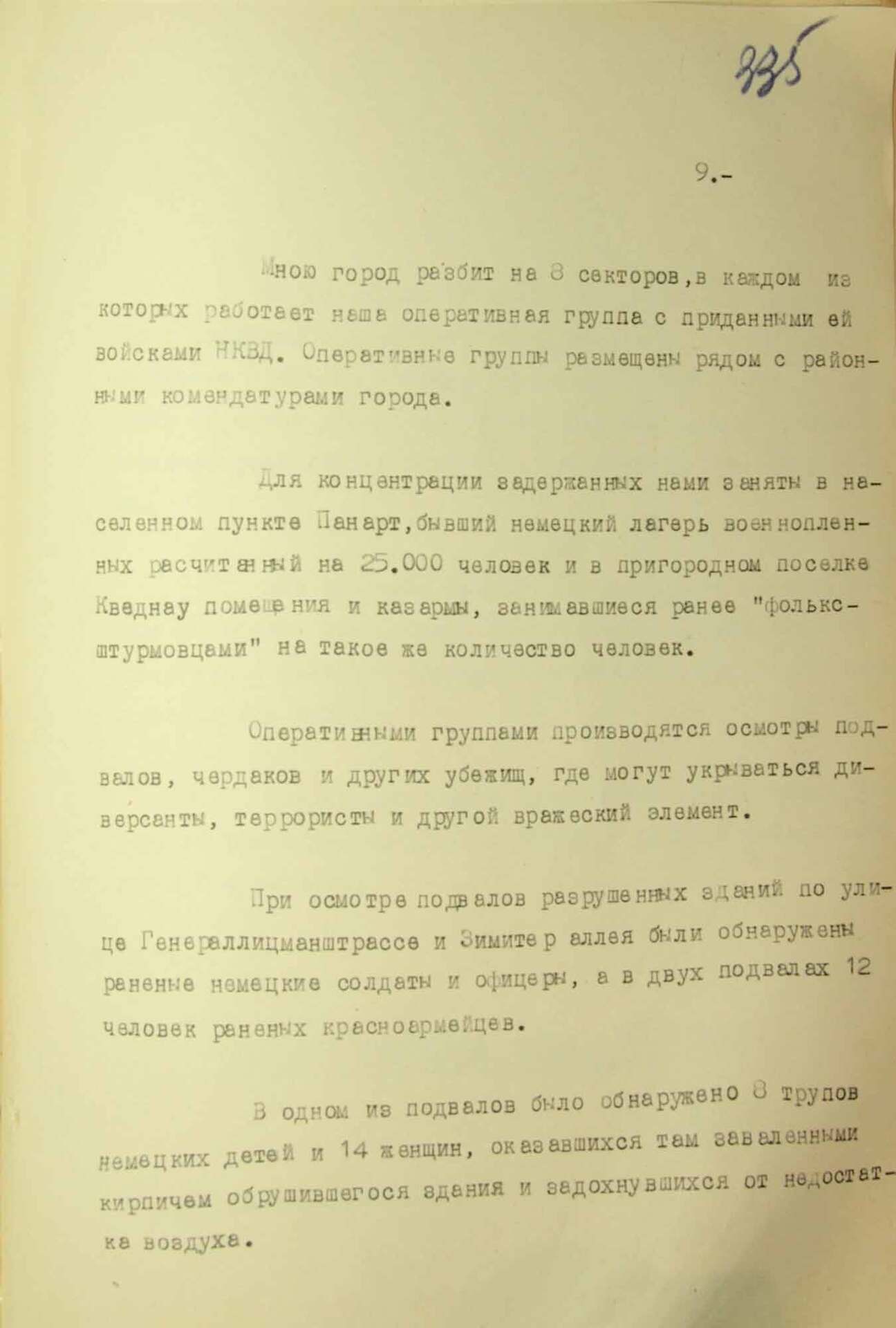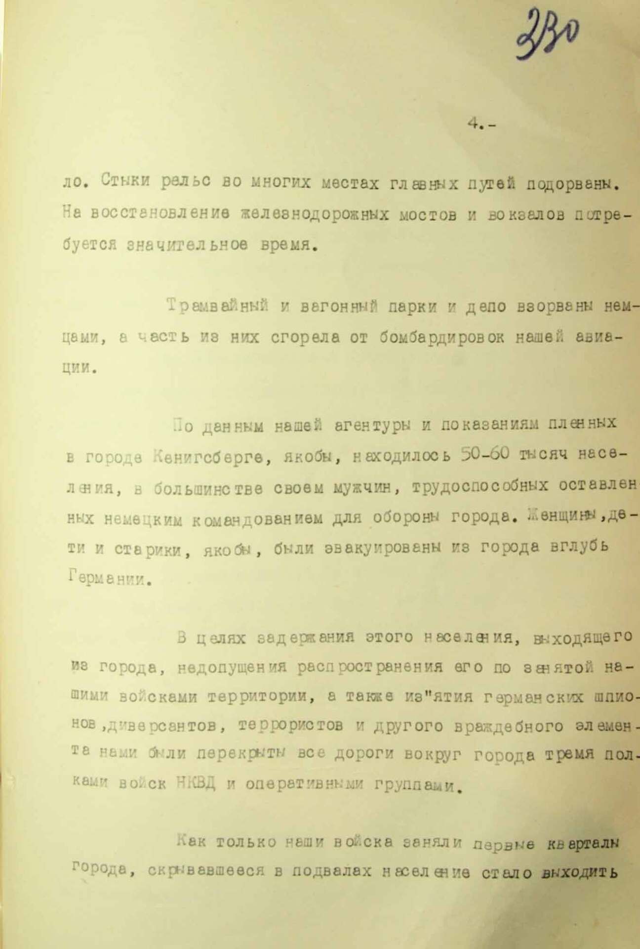 Докладная записка начальника УКР «Смерш» 3-го Белорусского фронта генерал-лейтенанта Павла Зеленина наркому внутренних дел СССР генеральному комиссару госбезопасности Лаврентию Берии о положении в Кёнигсберге. 18 апреля 1945 года. Кёнигсберг