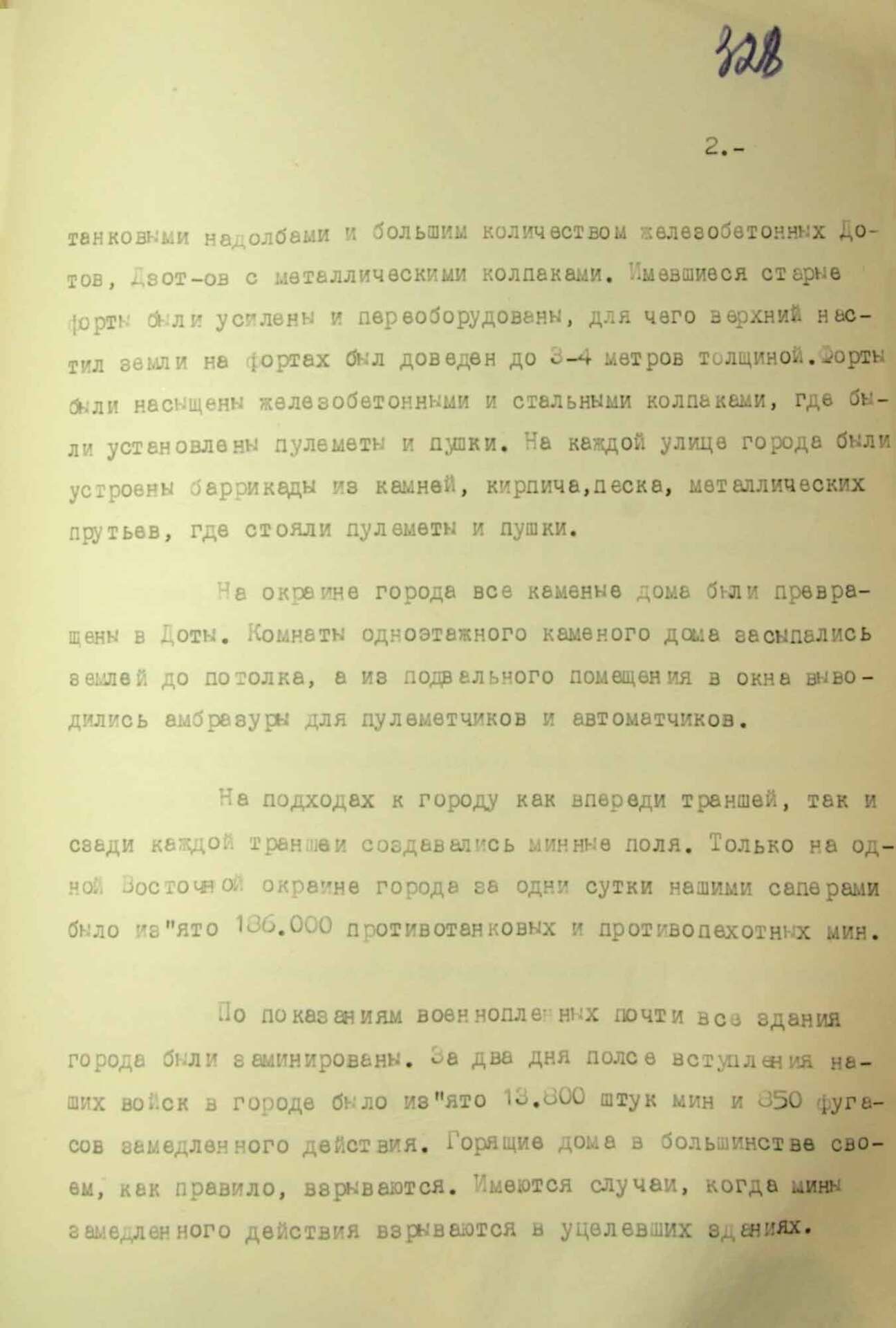 «На подходах к городу как впереди траншей, так и сзади каждой траншеи создавались минные поля. Только на одной восточной окраине города за одни сутки нашими сапёрами изъято 186 тысяч противотанковых и противопехотных мин. Почти все здания города были заминированы. За два дня после вступления наших войск в городе было изъято 13 800 штук мин и 850 фугасов замедленного действия », — говорится в документах.