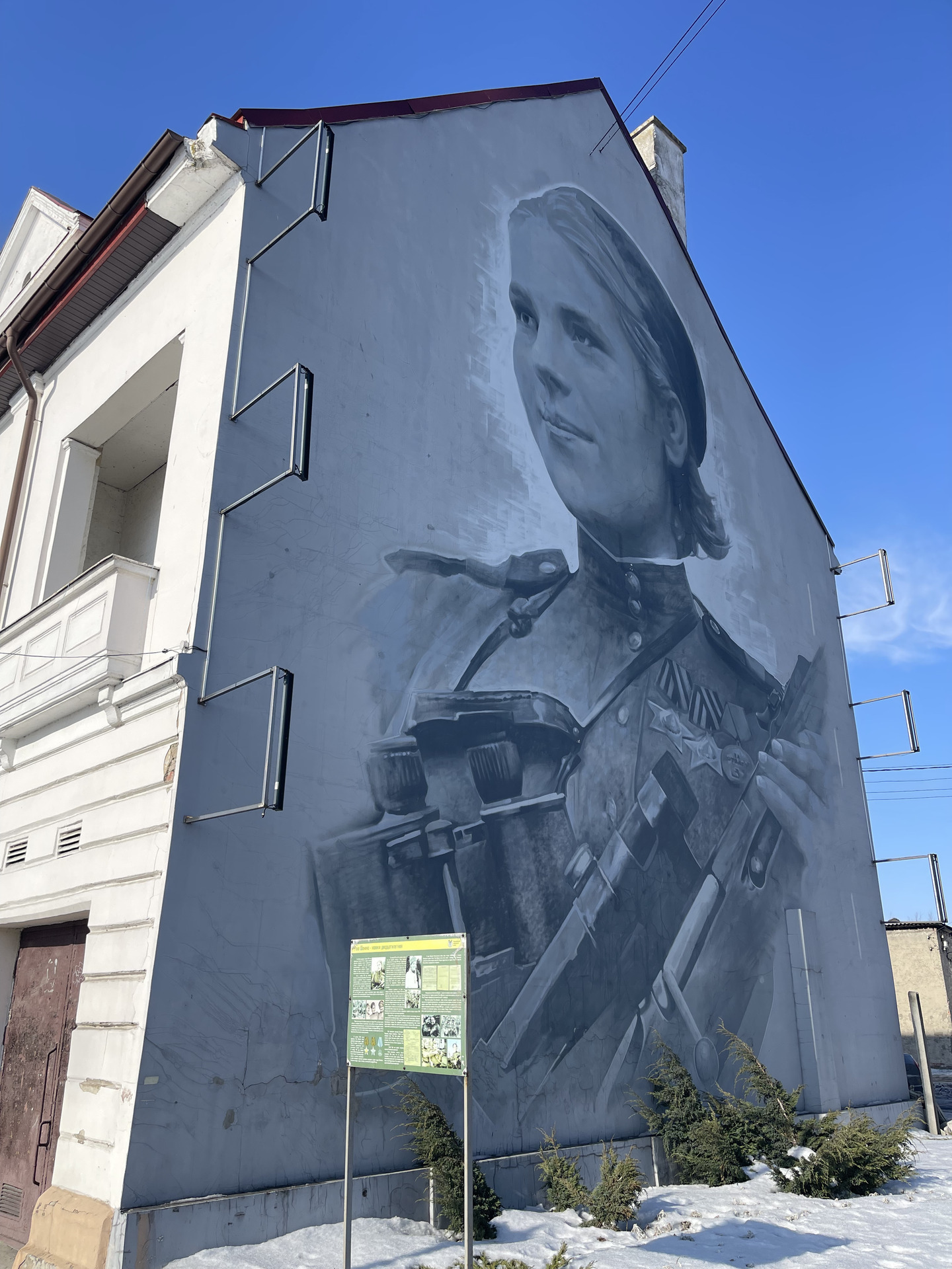 Второй мурал — отсылка к событиям Второй мировой войны. Рядом с портретом снайпера Розы Шаниной есть информационный стенд с историей жизни героической девушки.