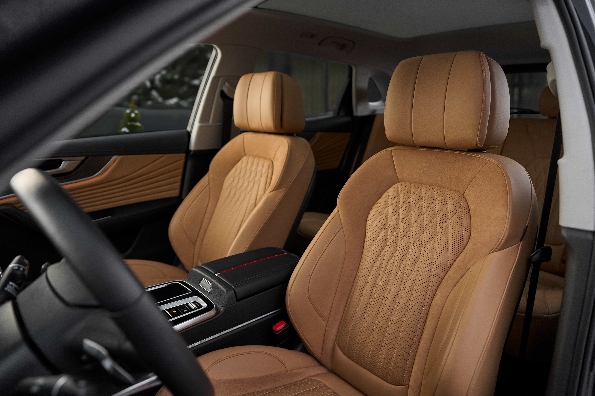 — Комфортабельный и просторный салон. Комбинированная отделка из высококачественных материалов, перфорированной кожи Nappa с прострочкой и замши Alсantara. Продуманный интерьер и отличная эргономика, много места для пассажиров и богатство дополнительных опций — подогрев сидений, вентиляция, аудиосистема премиум-класса, авиационные регулируемые подголовники.