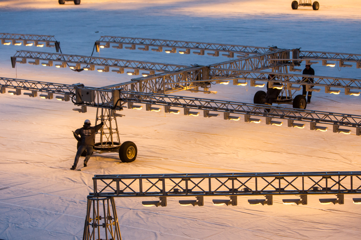 В МЧС «Клопс» заверили, что ничего чрезвычайного не происходит, просто начала работать система дополнительного освещения газона. Она позволяет поддерживать покрытие в идеальном состоянии даже зимой. Специальные установки передвигаются по полю и заменяют недостающий солнечный свет. Газон под ними накрыт плёнкой. Свет одновременно греет землю и даёт расти траве.