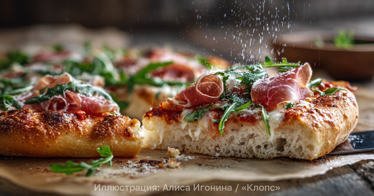 За счёт долгой холодной ферментации тесто получается пористым, лёгким и хорошо держит сочную начинку